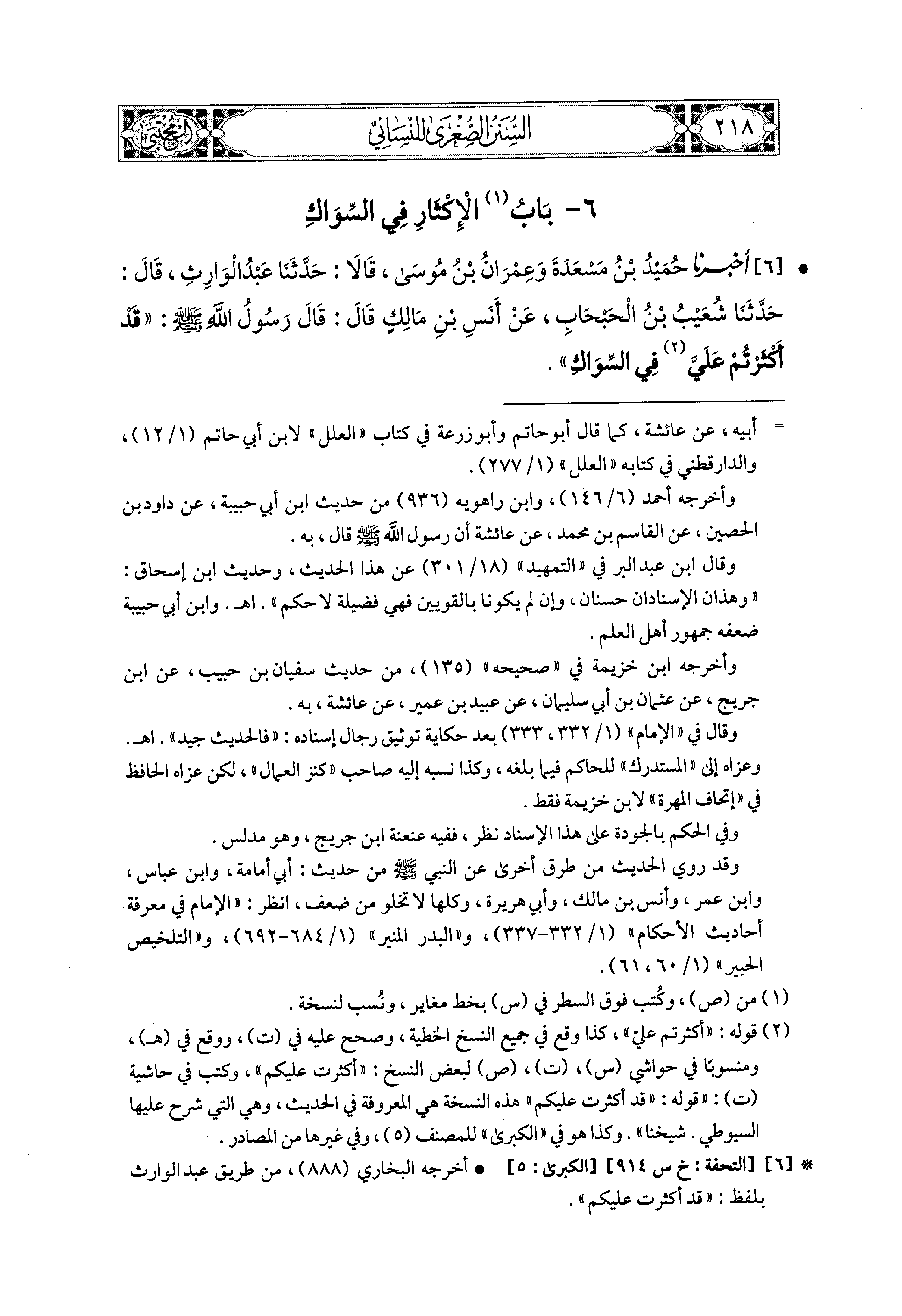 6- أَخبَرنا حُمَيدُ بنُ مَسْعَدَةَ، وَعِمْرَانُ بنُ مُوسَى قَالاَ: حَدَّثَنَا عَبدُ الوَارِثِ، قال: حَدَّثنا شُعَيبُ بنُ الحَبْحَابِ، عَن أَنَسِ بْنِ مَالِكٍ قَالَ: قَالَ رَسُولُ اللهِ صَلى الله عَليهِ وسَلم: قَدْ أَكْثَرْتُم عَلَي فِي السِّوَاكِ.