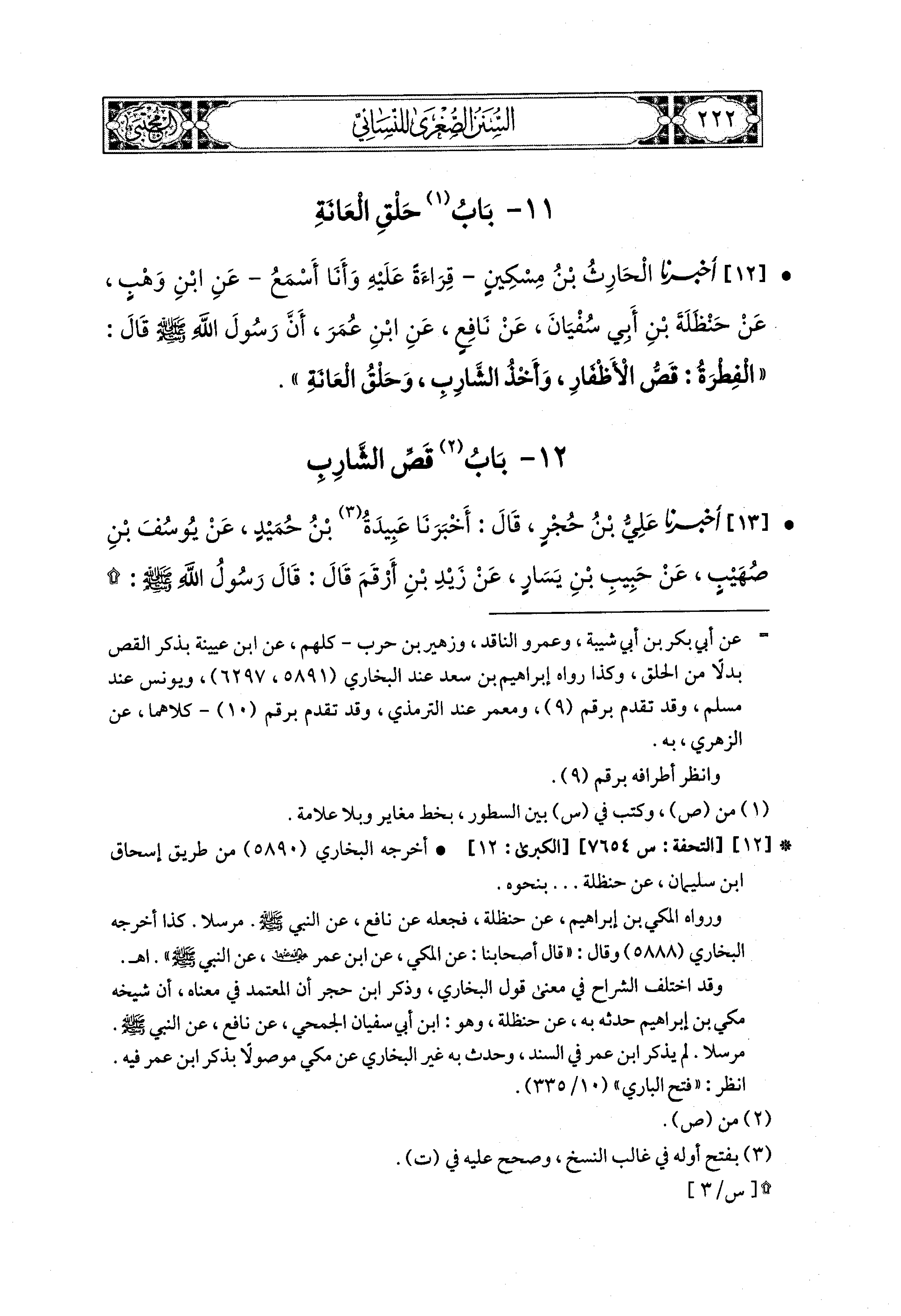 13- أَخبَرنا عَلِيُّ بنُ حُجْرٍ، قَالَ: أَخبَرَنا عَبِيدَةُ بنُ حُمَيدٍ، عَن يُوسُفَ بْنِ صُهَيْبٍ، عَن حَبِيبِ بْنِ يَسَارٍ، عَن زَيْدِ بْنِ أَرْقَمَ قَالَ: قَالَ رَسُولُ اللهِ صَلى الله عَليهِ وسَلم مَنْ لَمْ يَأْخُذْ شَارِبَهُ فَلَيْسَ مِنَّا.