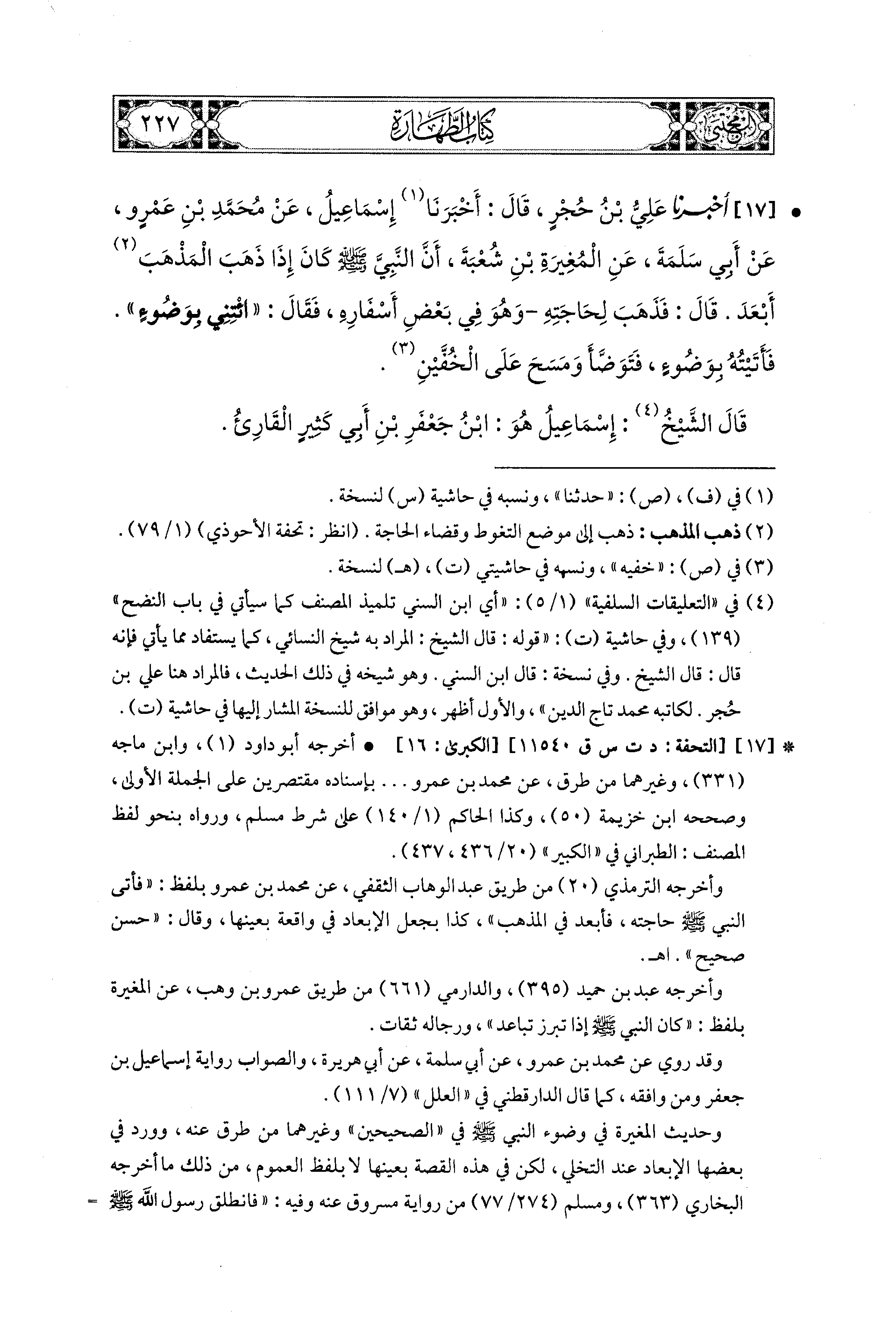 17- أَخبَرنا عَلِيُّ بنُ حُجْرٍ، قَالَ: أَخبَرَنا إِسماعِيلُ، عَن مُحَمَّدِ بْنِ عَمْرٍو، عَن أَبي سَلَمَةَ، عَنِ المُغِيرَةِ بْنِ شُعبَةَ، أَنَّ النَّبيَّ صَلى الله عَليهِ وسَلم كَانَ إِذَا ذَهَبَ المَذْهَبَ أَبْعَدَ، قَالَ: فَذَهَبَ لِحَاجَتِهِ وَهُوَ فِي بَعْضِ أَسْفَارِهِ فَقَالَ: ائْتِنِي بِوَضُوءٍ، فَأَتَيْتُهُ بِوَضُوءٍ، فَتَوَضَّأَ وَمَسَحَ عَلَى الخُفَّيْنِ.