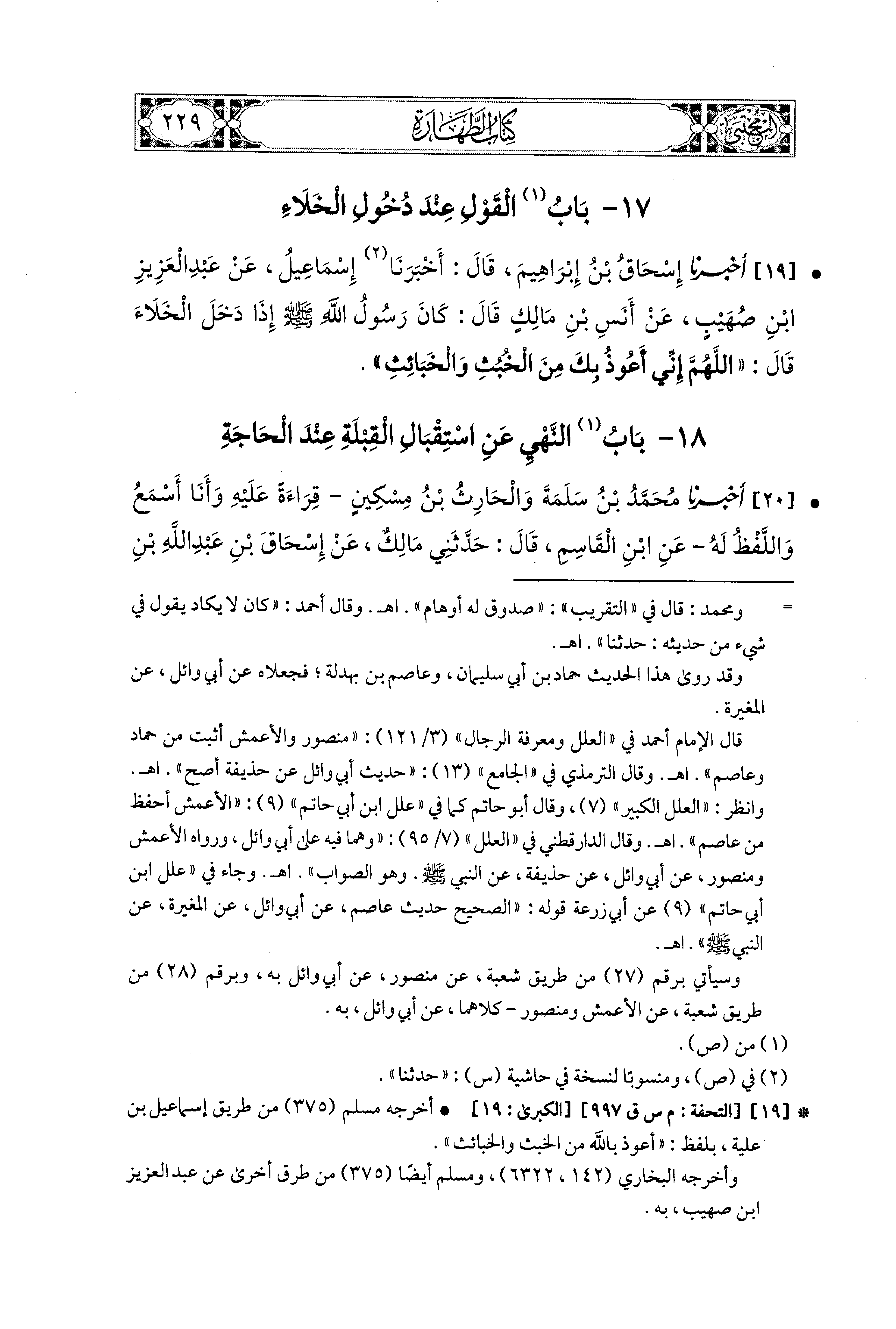 19- أَخبَرنا إِسْحَاقُ بنُ إِبرَاهيمَ، قَالَ: أَخبَرَنا إِسماعِيلُ، عَن عَبدِ العَزِيزِ بْنِ صُهَيْبٍ، عَن أَنَسِ بْنِ مَالِكٍ قَالَ: كَانَ رَسُولُ اللهِ صَلى الله عَليهِ وسَلم إِذَا دَخَلَ الخَلاَءَ قَالَ: اللهُمَّ إِنِّي أَعُوذُ بِكَ مِنَ الخُبُثِ وَالخَبَائِثِ.