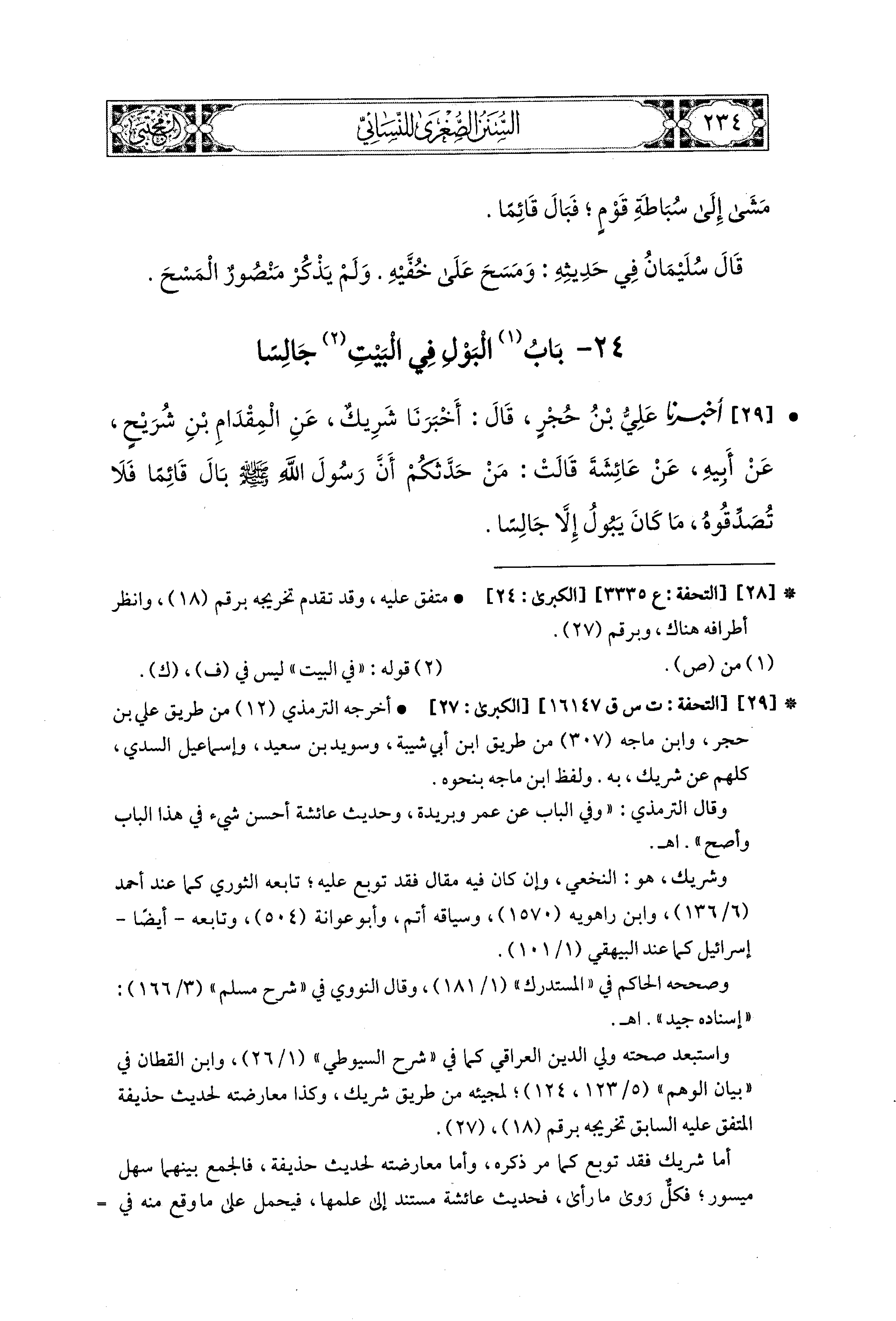 29- أَخبَرنا عَلِيُّ بنُ حُجْرٍ، قَالَ: أَخبَرَنا شَرِيكٌ، عَنِ المِقْدَامِ بْنِ شُرَيْحٍ، عَن أَبيهِ، عَن عَائِشَةَ قَالَتْ: مَنْ حَدَّثَكُمْ أَنَّ رَسُولَ اللهِ صَلى الله عَليهِ وسَلم بَالَ قَائِمًا فَلاَ تُصَدِّقُوهُ؛ مَا كَانَ يَبُولُ إِلاَّ جَالِسًا.