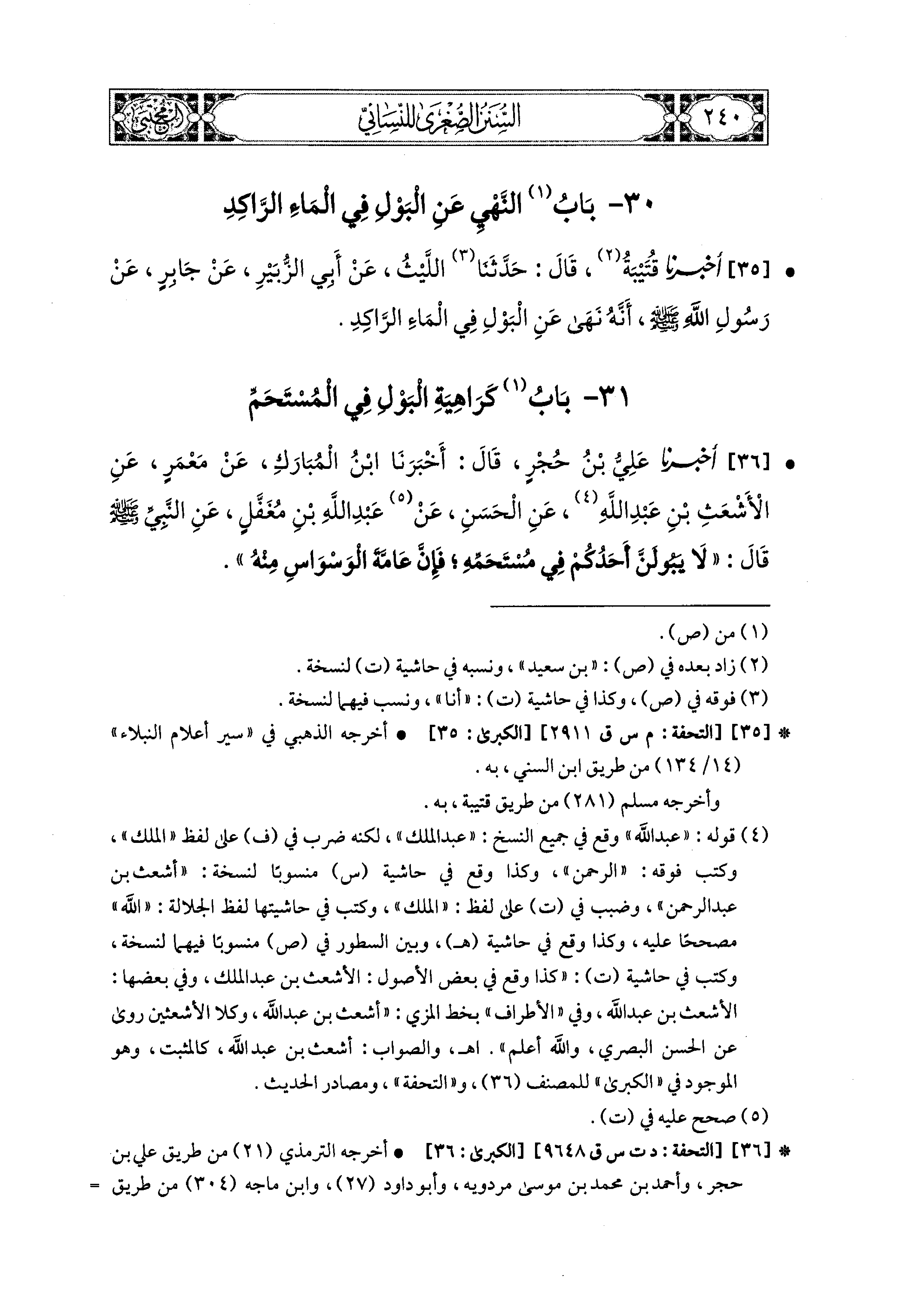 35 - أَخبَرنا قُتَيبَةُ، قال: حَدَّثنا اللَّيْثُ، عَن أَبي الزُّبَيْرِ، عَن جَابِرٍ، عَن رَسُولِ اللهِ صَلى الله عَليهِ وسَلم؛ أَنَّهُ نَهَى عَنِ البَوْلِ فِي المَاءِ الرَّاكِدِ.