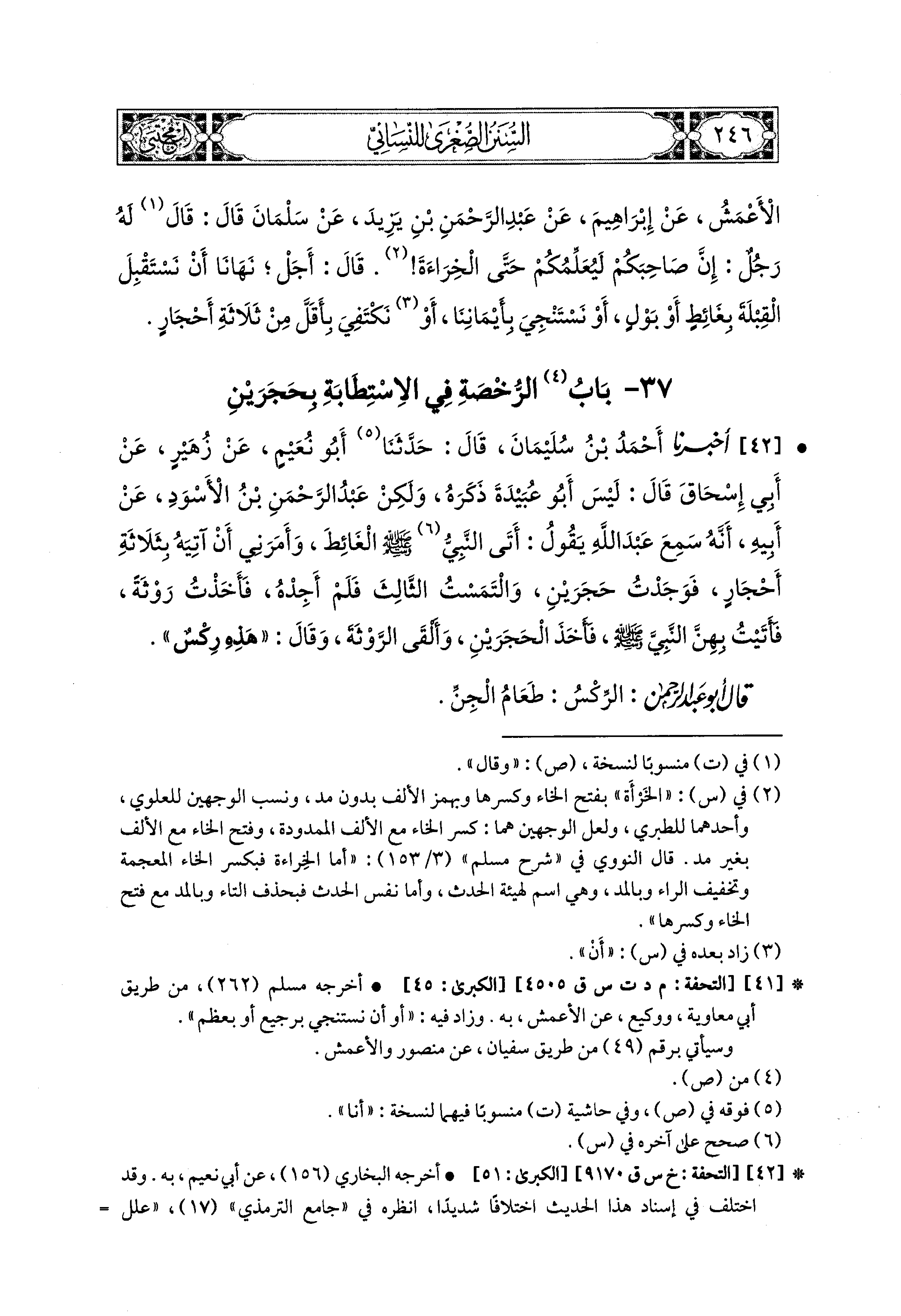 42 - أَخبَرنا أَحْمَدُ بنُ سُليمَانَ، قال: حَدَّثنا أَبُو نُعَيْمٍ، عَن زُهَيْرٍ، عَن أَبي إِسْحَاقَ، قَالَ: لَيْسَ أَبُو عُبَيدَةَ ذَكَرَهُ، وَلَكِنْ عَبدُ الرَّحمَنِ بنُ الأَسْوَدِ، عَن أَبيهِ، أَنَّهُ سَمِعَ عَبدَ اللهِ يَقُولُ: أَتَى النَّبيُّ صَلى الله عَليهِ وسَلم الغَائِطَ، وَأَمَرَنِي أَنْ آتِيَهُ بِثَلاَثَةِ أَحْجَارٍ، فَوَجَدْتُ حَجَرَيْنِ وَالتَمَسْتُ الثَّالِثَ فَلَمْ أَجِدْهُ، فَأَخَذْتُ رَوْثَةً فَأَتَيْتُ بِهِنَّ النَّبيَّ صَلى الله عَليه وَسَلم، فَأَخَذَ الحَجَرَيْنِ وَأَلْقَى الرَّوْثَةَ، وَقَالَ: هَذِهِ رِكْسٌ.