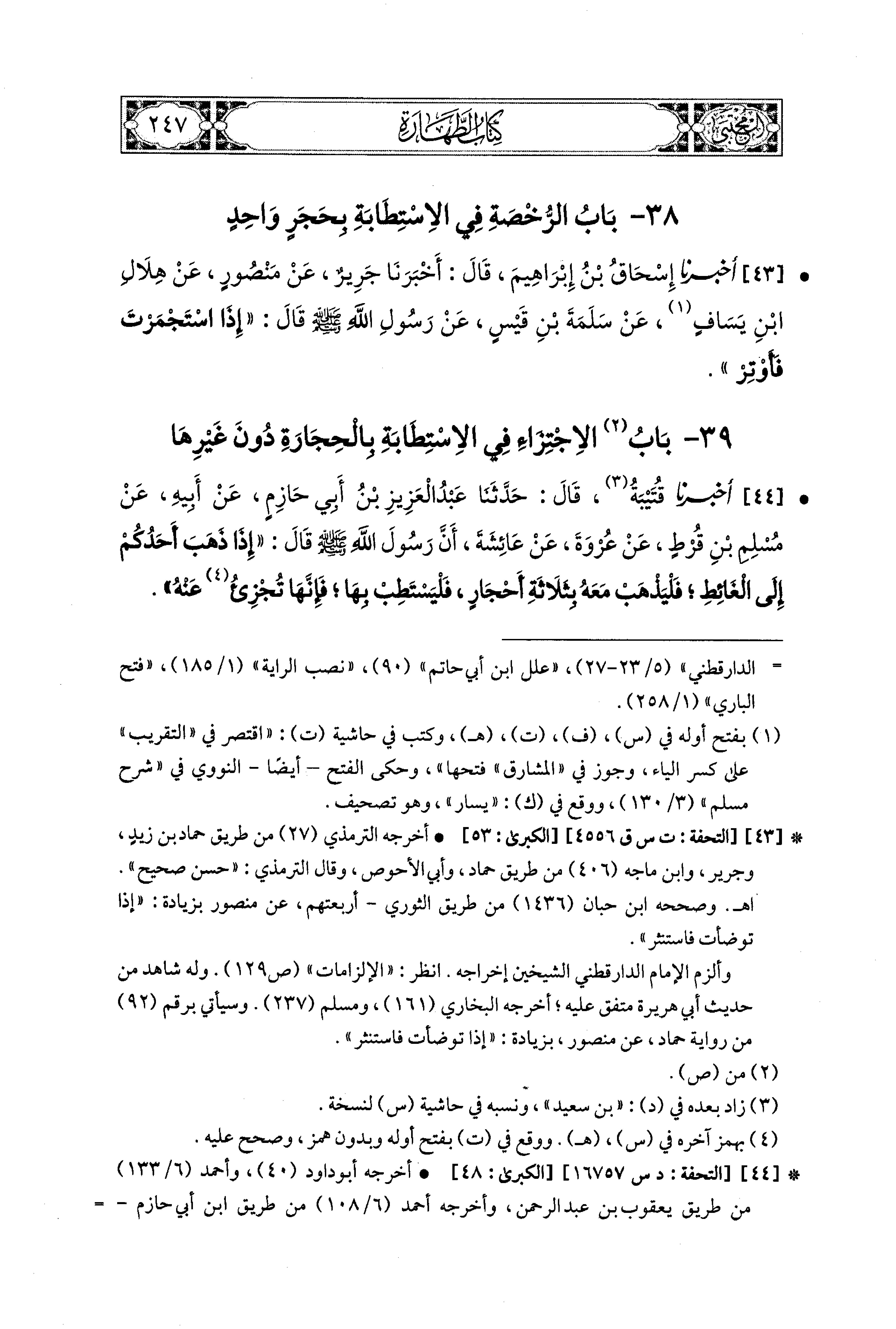 43- أَخبَرنا إِسْحَاقُ بنُ إِبرَاهيمَ، قَالَ: أَخبَرَنا جَرِيرٌ، عَن مَنْصُورٍ، عَن هِلاَلِ بْنِ يَسَافٍ، عَن سَلَمَةَ بْنِ قَيْسٍ، عَن رَسُولِ اللهِ صَلى الله عَليهِ وسَلم قَالَ: إِذَا اسْتَجْمَرْتَ فَأَوْتِرْ.