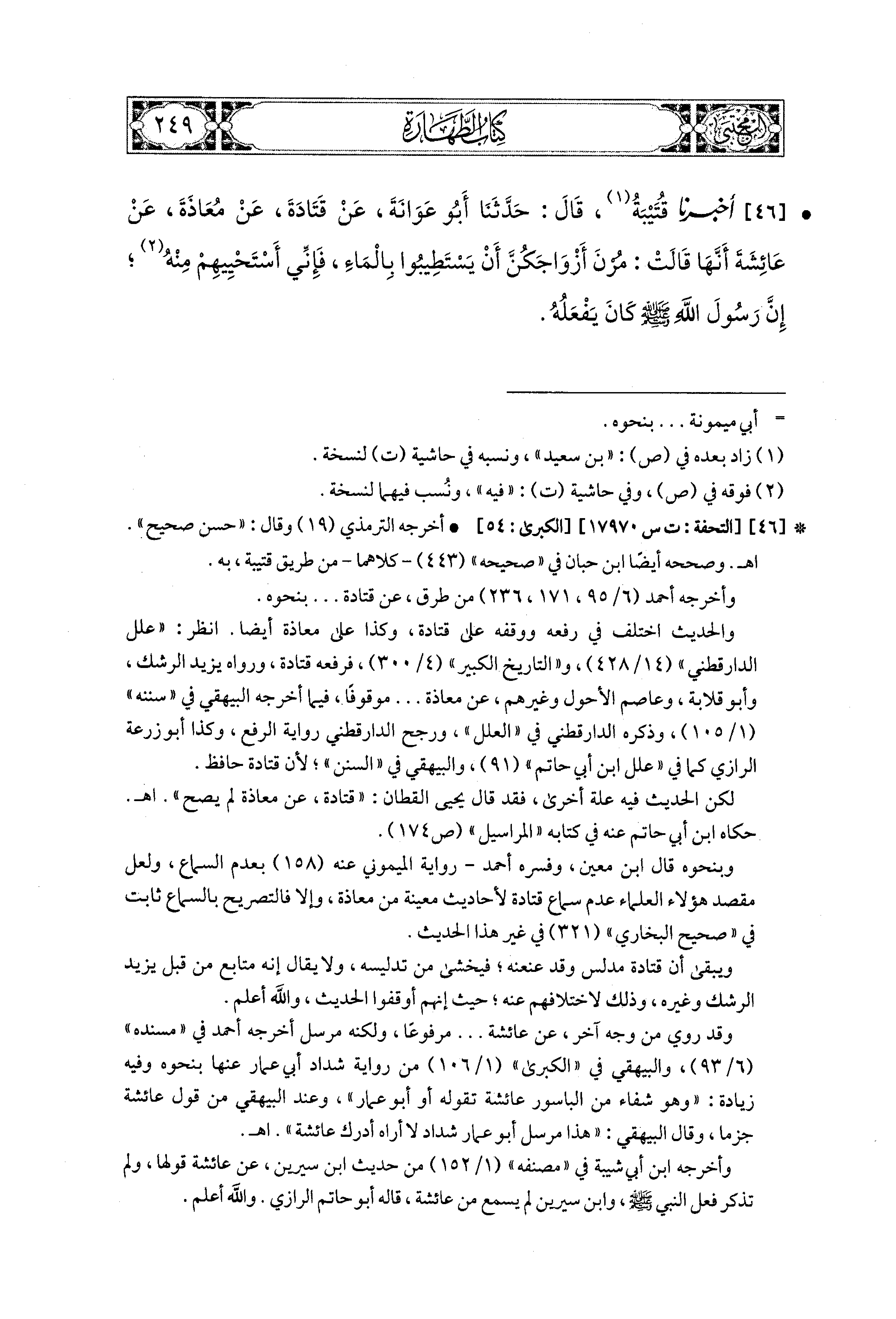 46- أَخبَرنا قُتَيبَةُ، قال: حَدَّثنا أَبُو عَوَانَةَ، عَن قَتَادَةَ، عَن مُعَاذَةَ، عَن عَائِشَةَ أَنَّهَا قَالَتْ: مُرْنَ أَزْوَاجَكُنَّ أَنْ يَسْتَطِيبُوا بِالمَاءِ، فَإِنِّي أَسْتَحْيِيهِمْ مِنْهُ، إِنَّ رَسُولَ اللهِ صَلى الله عَليهِ وسَلم كَانَ يَفْعَلُهُ.