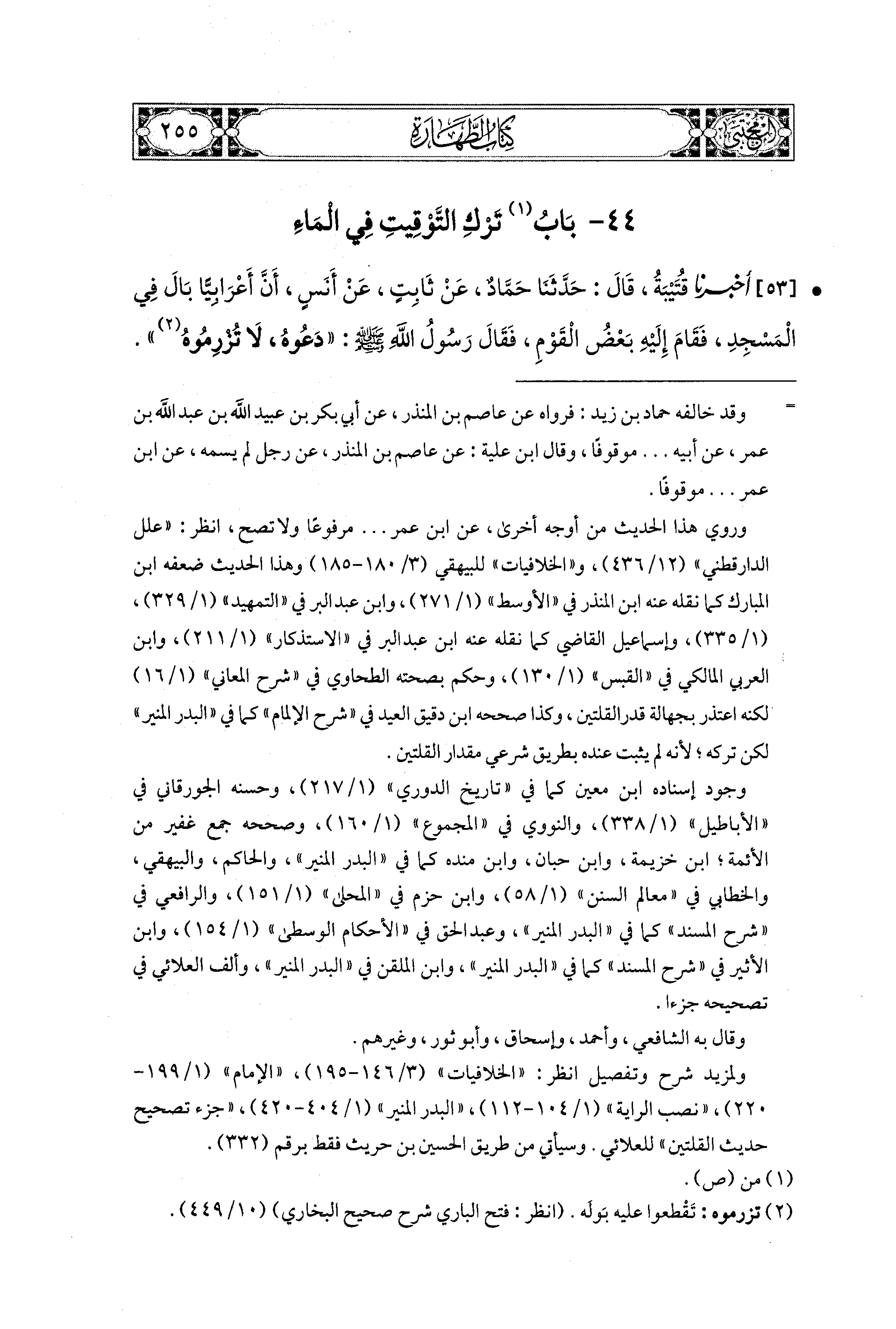 53- أَخبَرنا قُتَيبَةُ، قال: حَدَّثنا حَمَّادٌ، عَن ثَابِتٍ، عَن أَنَسٍ أَنَّ أَعْرَابيًّا بَالَ فِي المَسْجِدِ، فَقَامَ إليه بَعْضُ القَوْمِ فَقَالَ رَسُولُ اللهِ صَلى الله عَليهِ وسَلم: دَعُوهُ لاَ تُزْرِمُوهُ. فَلَمَّا فَرَغَ دَعَا بِدَلْوٍ فَصَبَّهُ عَلَيهِ.