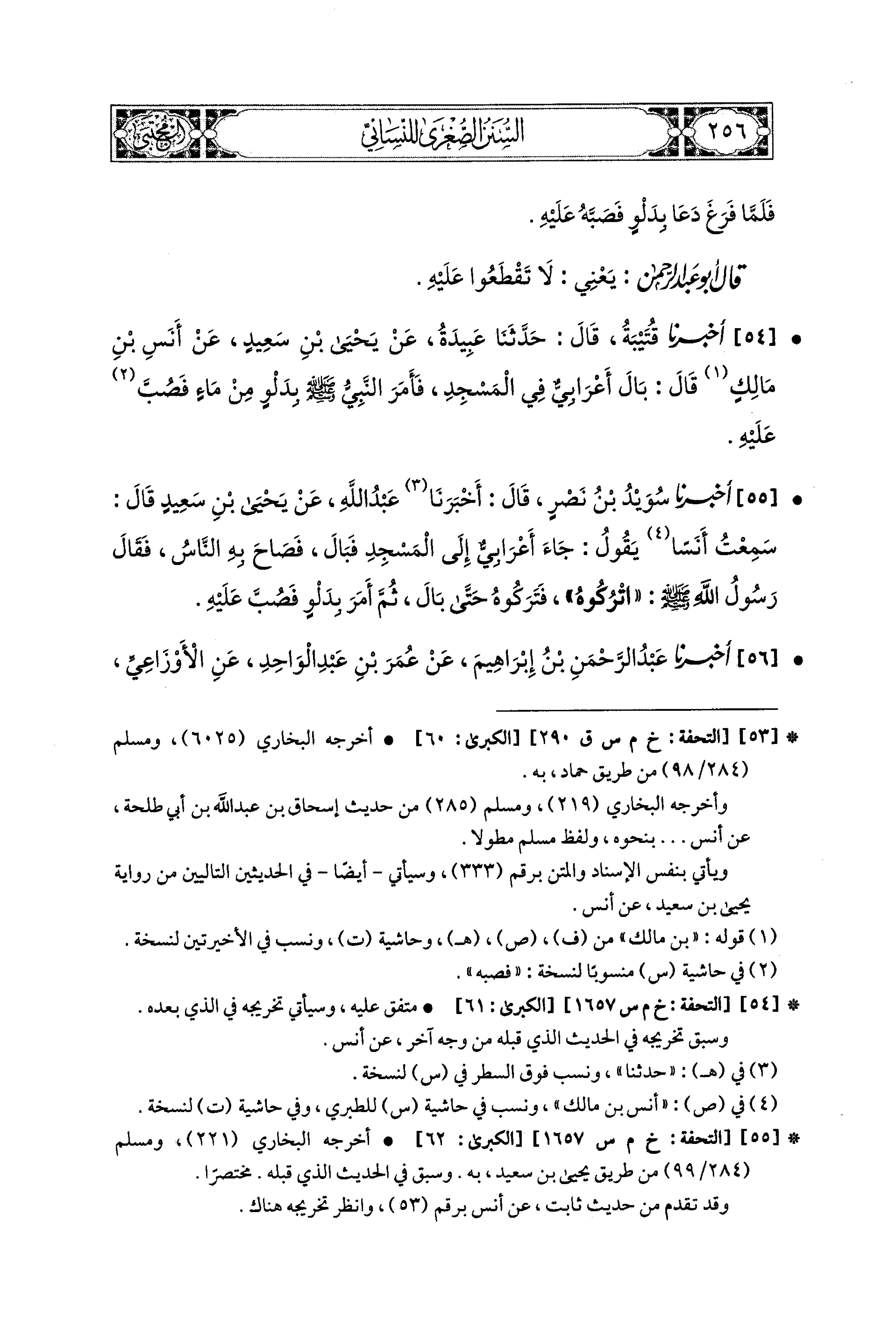 54- أَخبَرنا قُتَيبَةُ، قال: حَدَّثنا عَبِيدَةُ، عَن يَحْيَى بْنِ سَعِيدٍ، عَن أَنَسٍ بن مالك قَالَ: بَالَ أَعْرَابيٌّ فِي المَسْجِدِ، فَأَمَرَ النَّبيُّ صَلى الله عَليهِ وسَلم بِدَلْوٍ مِنْ مَاءٍ فَصُبَّ عَلَيهِ.
