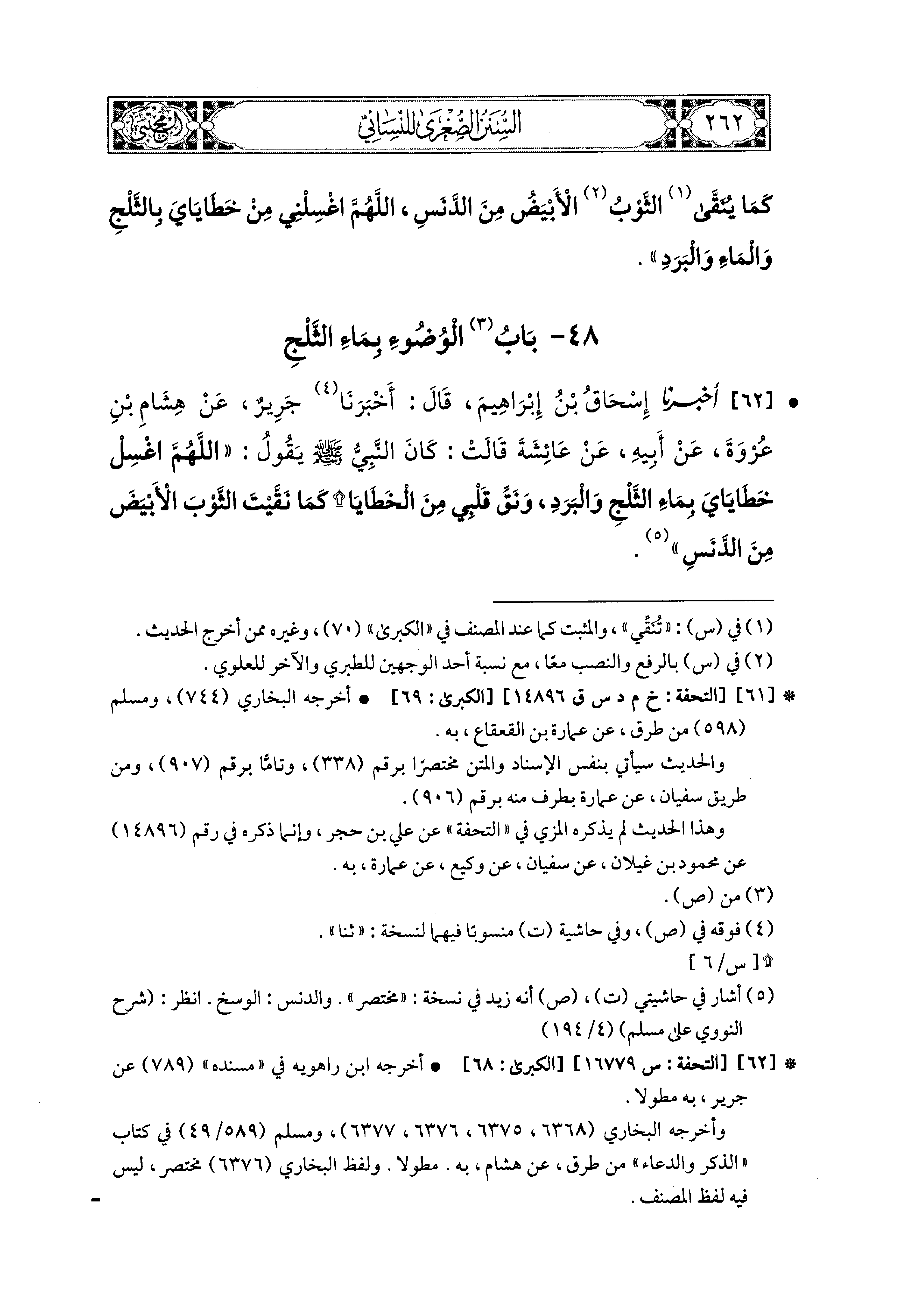 62- أَخبَرنا إِسْحَاقُ بنُ إِبرَاهيمَ، قَالَ: أَخبَرَنا جَرِيرٌ، عَن هِشَامِ بْنِ عُرْوَةَ، عَن أَبيهِ، عَن عَائِشَةَ قَالَتْ: كَانَ النَّبيُّ صَلى الله عَليهِ وسَلم يَقُولُ: اللهُمَّ اغْسِلْ خَطَايَايَ بِمَاءِ الثَّلْجِ وَالبَرَدِ، وَنَقِّ قَلْبِي مِنَ الخَطَايَا كَمَا نَقَّيْتَ الثَّوْبَ الأَبْيَضَ مِنَ الدَّنَسِ.
