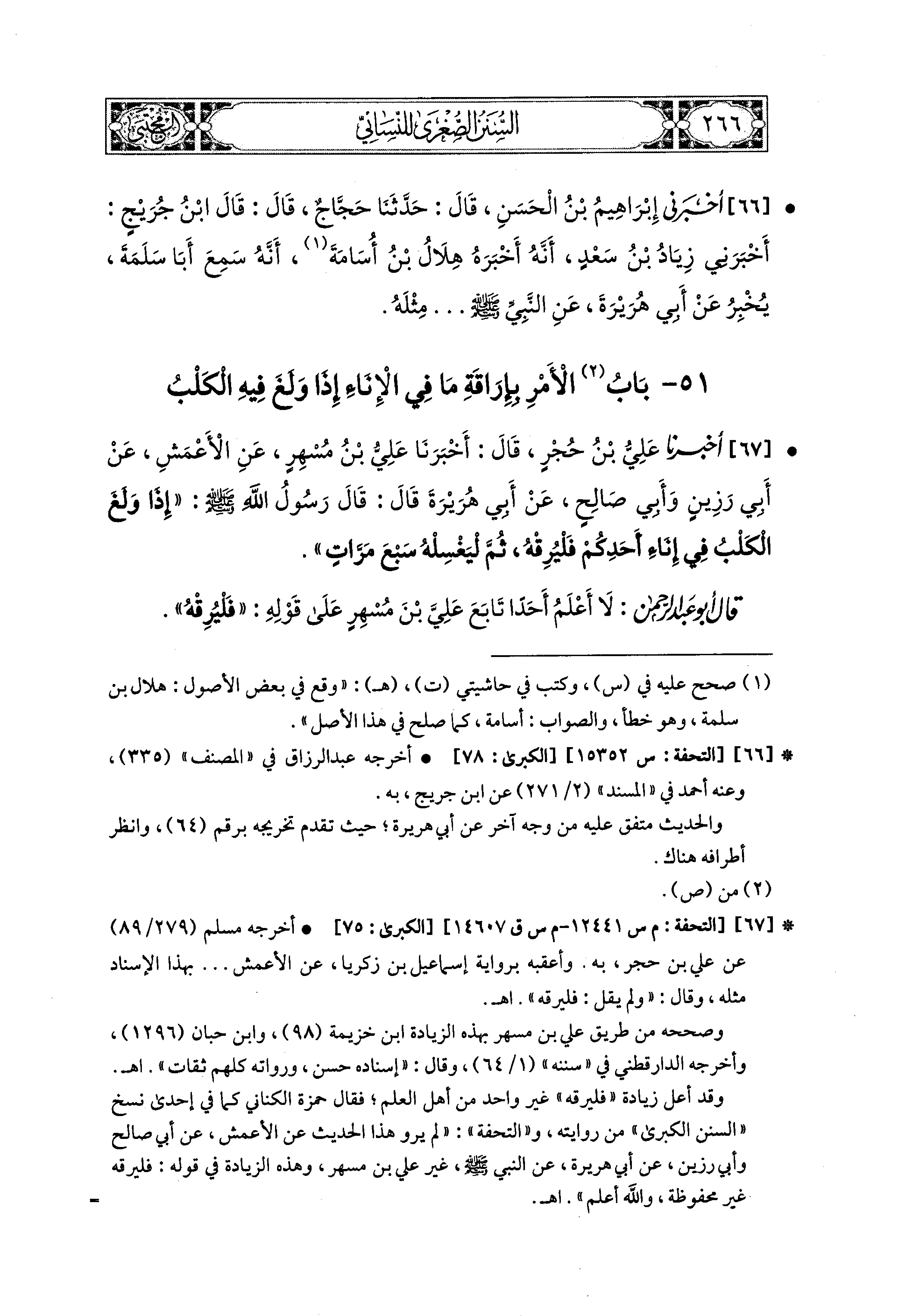 67- أَخبَرنا عَلِيُّ بنُ حُجْرٍ، قَالَ: أَخبَرَنا عَلِيُّ بنُ مُسْهِرٍ، عَنِ الأَعْمَشِ، عَن أَبي رَزِينٍ وَأَبي صَالِحٍ، عَن أَبي هُرَيرَةَ قَالَ: قَالَ رَسُولُ اللهِ صَلى الله عَليهِ وسَلم: إِذَا وَلَغَ الكَلْبُ فِي إِنَاءِ أَحَدِكُمْ، فَلْيُرِقْهُ، ثُمَّ لِيَغْسِلْهُ سَبْعَ مَرَّاتٍ.