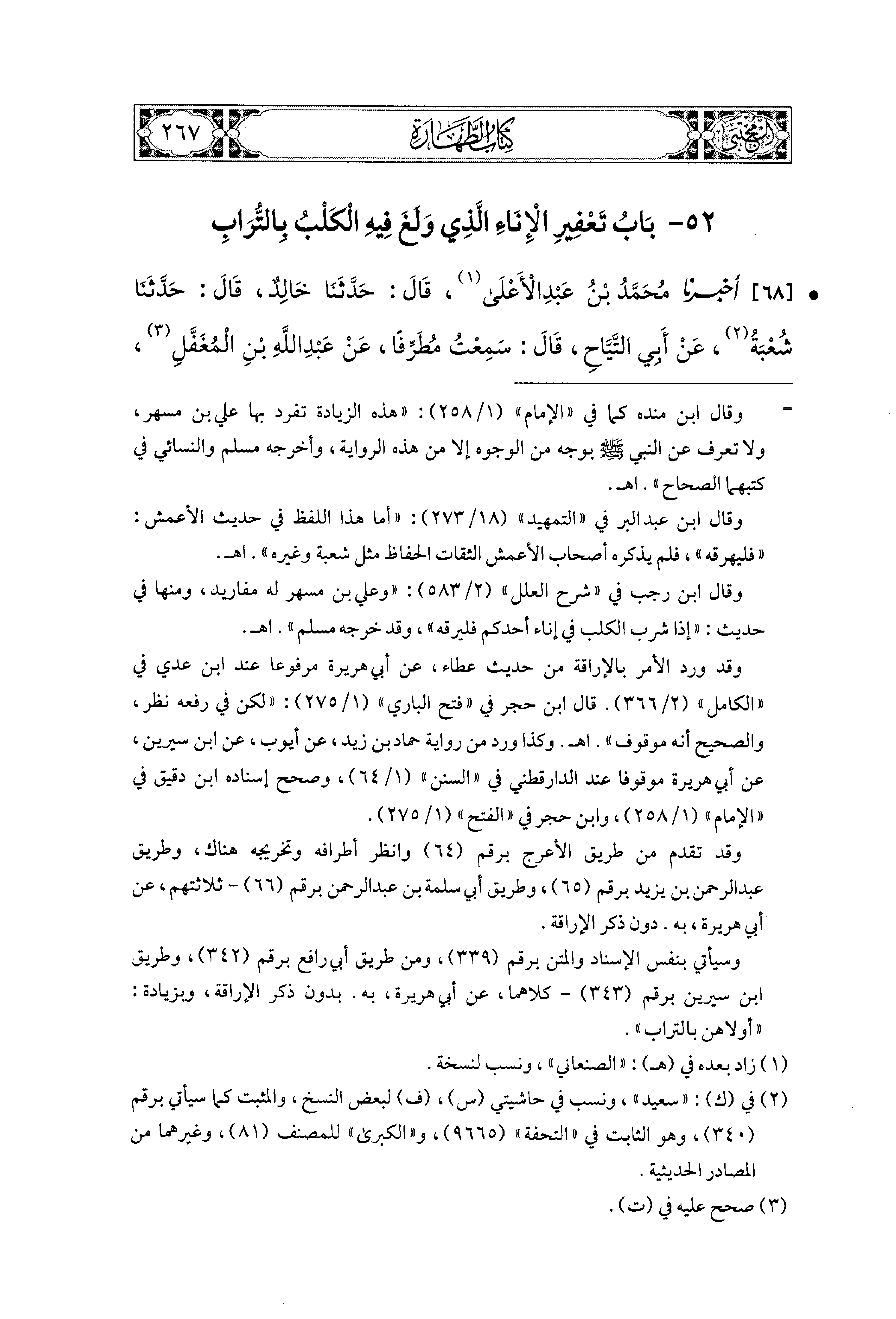 68- أَخبَرنا مُحَمد بن عَبدِ الأَعلَى، قال: حَدَّثنا خَالِدٌ، قال: حَدَّثَنَا شُعبَةُ، عَن أَبي التَّيَّاحِ، قَالَ: سَمِعْتُ مُطَرِّفًا، عَن عَبد اللهِ بن المُغَفَّلِ، أَنَّ رَسُولَ اللهِ صَلى الله عَليهِ وسَلم أَمَرَ بِقَتْلِ الكِلاَبِ، وَرَخَّصَ فِي كَلْبِ الصَّيْدِ وَالغَنَمِ وَقَالَ: إِذَا وَلَغَ الكَلْبُ فِي الإِنَاءِ فَاغْسِلُوهُ سَبْعَ مَرَّاتٍ، وَعَفِّرُوا الثَّامِنَةَ بِالتُّرَابِ.