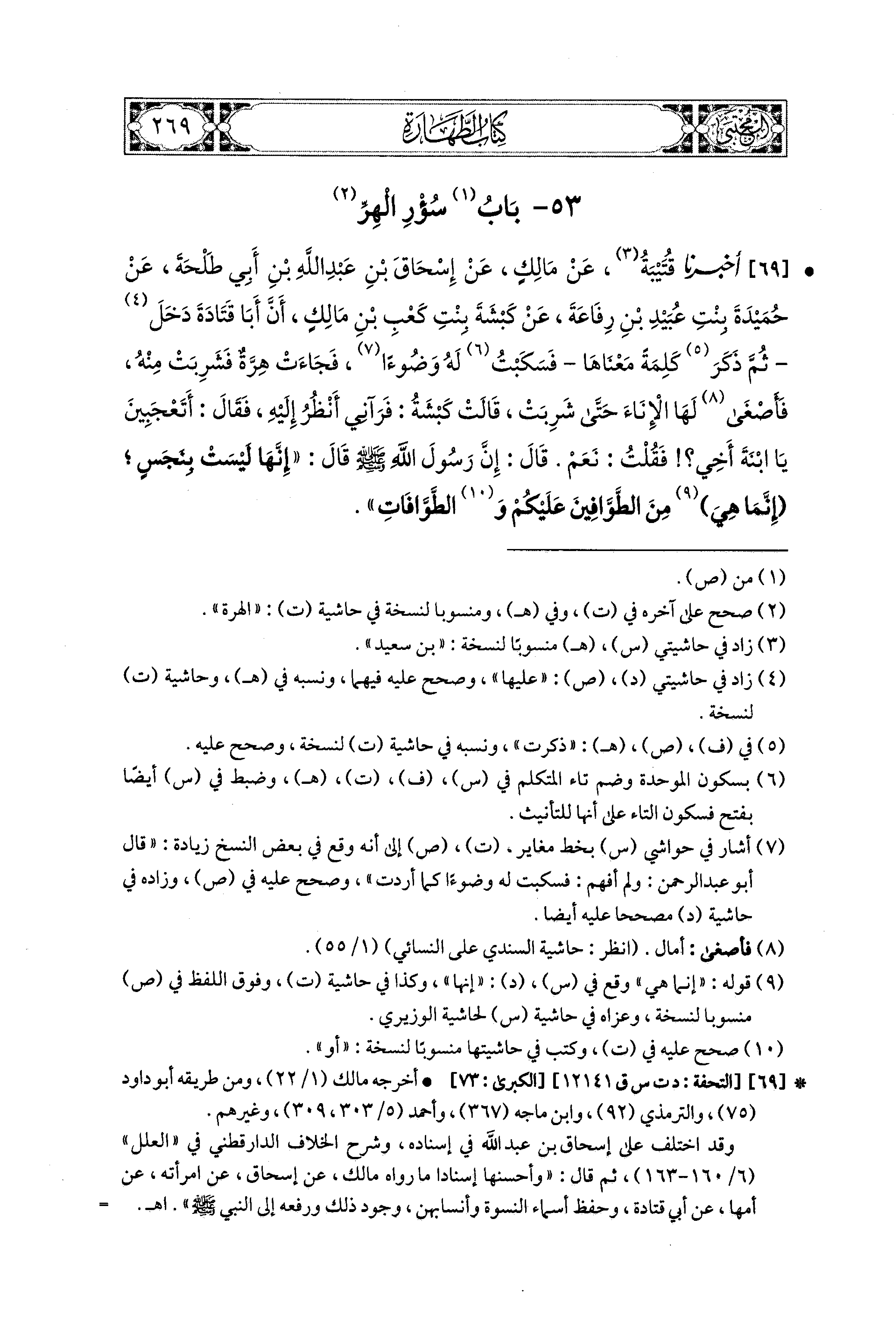 69- أَخبَرنا قُتَيبَةُ، عَن مَالِكٍ، عَن إِسْحَاقَ بْنِ عَبدِ اللهِ بْنِ أَبي طَلْحَةَ، عَن حُمَيدَةَ بِنْتِ عُبَيدِ بْنِ رِفَاعَةَ، عَن كَبْشَةَ بِنْتِ كَعْبِ بْنِ مَالِكٍ، أَنَّ أَبَا قَتَادَةَ دَخَلَ، ثُمَّ ذَكَرَ كَلِمَةً مَعْنَاهَا، فَسَكَبْتُ لَهُ وَضُوءًا، فَجَاءَتْ هِرَّةٌ فَشَرِبَتْ مِنْهُ، فَأَصْغَى لَهَا الإِنَاءَ حَتَّى شَرِبَتْ، قَالَتْ كَبْشَةُ: فَرَآنِي أَنْظُرُ إِلَيْهِ، فَقَالَ: أَتَعْجَبِينَ يَا ابنَةَ أَخِي؟ فَقُلْتُ: نَعَمْ، قَالَ: إِنَّ رَسُولَ اللهِ صَلى الله عَليهِ وسَلم قَالَ: إِنَّهَا لَيْسَتْ بِنَجَسٍ، إِنَّمَا هِيَ مِنَ الطَّوَّافِينَ عَلَيْكُمْ وَالطَّوَّافَاتِ.