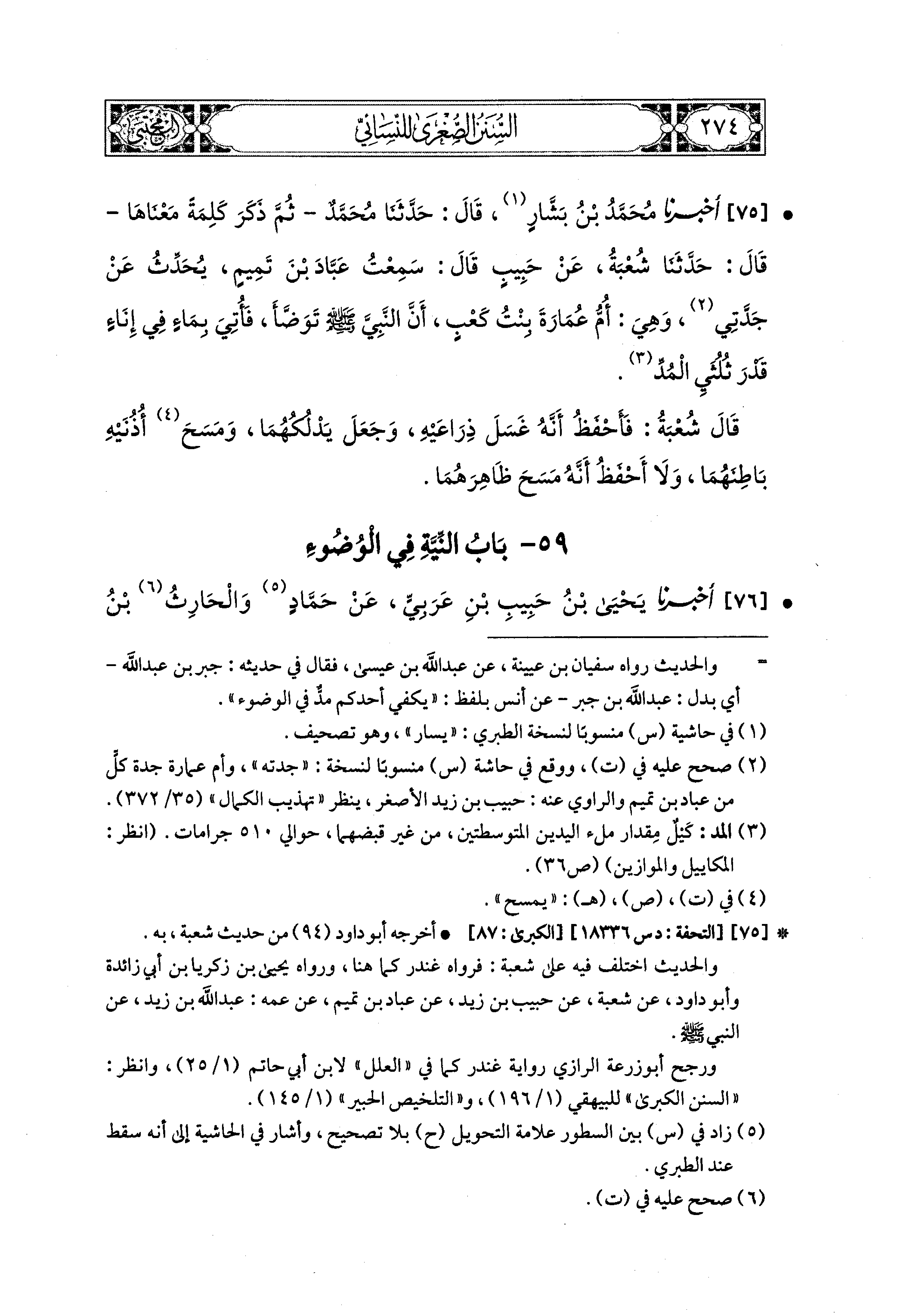 75- أَخبَرنا مُحَمد بنُ بَشَّارٍ، قال: حَدَّثنا مُحَمَّدٌ، ثُمَّ ذَكَرَ كَلِمَةً مَعْنَاهَا، قال: حَدَّثَنَا شُعبَةُ، عَن حَبِيبٍ، قَالَ: سَمِعْتُ عَبَّادَ بْنَ تَميمٍ يُحَدِّثُ، عَن جَدَّتِي وَهِيَ أُمُّ عُمَارَةَ بِنْتُ كَعْبٍ، أَنَّ النَّبيَّ صَلى الله عَليهِ وسَلم تَوَضَّأَ فَأُتِيَ بِمَاءٍ فِي إِنَاءٍ قَدْرَ ثُلُثَيِ المُدِّ.