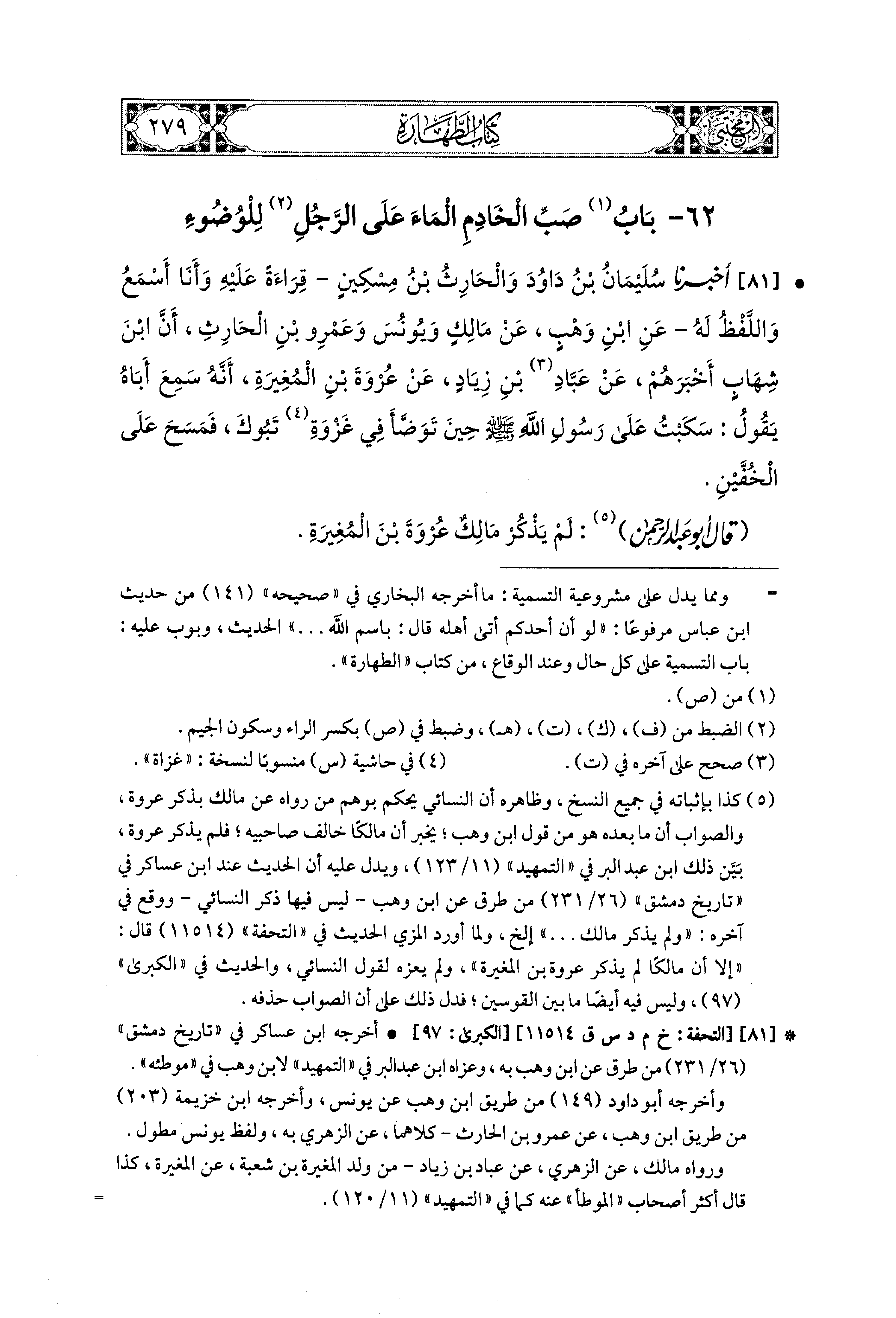 81- أَخبَرنا سُليمَانُ بنُ دَاوُدَ، وَالحَارِثُ بنُ مِسكينٍ، قِرَاءَةً عَلَيهِ وَأَنَا أَسْمَعُ، وَاللَّفْظُ لَهُ، عَنِ ابنِ وَهْبٍ، عَن مَالِكٍ، وَيُونُسَ، وَعَمْرِو بْنِ الحَارِثِ، أَنَّ ابنَ شِهَابٍ أَخْبَرَهُمْ، عَن عَبَّادِ بْنِ زِيَادٍ، عَن عُرْوَةَ بْنِ المُغِيرَةِ، أَنَّهُ سَمِعَ أَبَاهُ يَقُولُ: سَكَبْتُ عَلَى رَسُولِ اللهِ صَلى الله عَليهِ وسَلم حِينَ تَوَضَّأَ فِي غَزْوَةِ تَبُوكَ فَمَسَحَ عَلَى الخُفَّيْنِ.