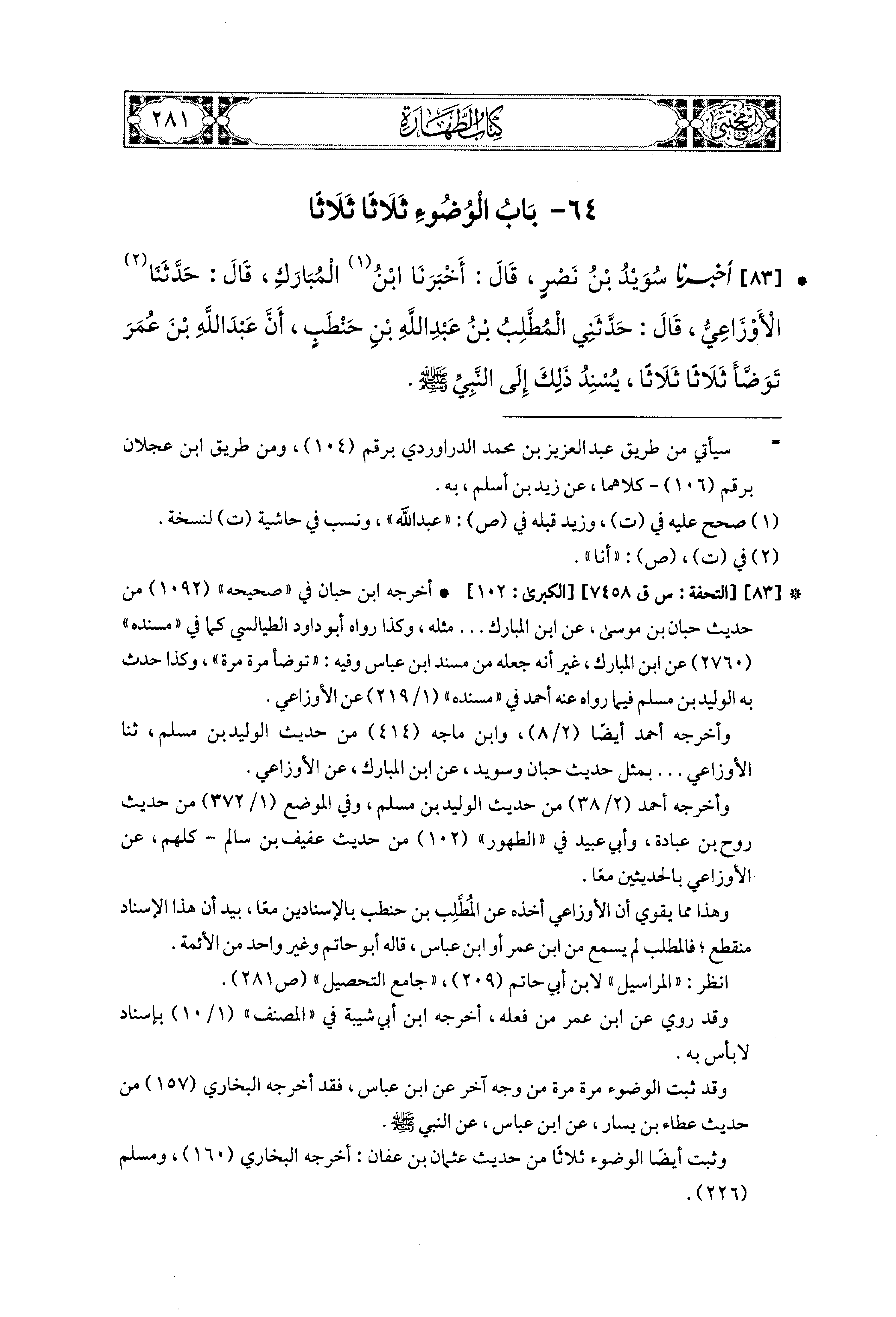 83- أَخبَرنا سُوَيْدُ بنُ نَصْرٍ، قَالَ: أَخبَرَنا بنُ المُبَارَكِ، قَالَ: حَدَّثنا الأَوْزَاعِيُّ، قَالَ: حَدَّثني المُطَّلِبُ بنُ عَبدِ اللهِ بْنِ حَنْطَبٍ، أَنَّ عَبدَ اللهِ بْنَ عُمَرَ تَوَضَّأَ ثَلاَثًا ثَلاَثًا، يُسْنِدُ ذَلِكَ إِلَى النَّبيِّ صَلى الله عَليهِ وسَلم.