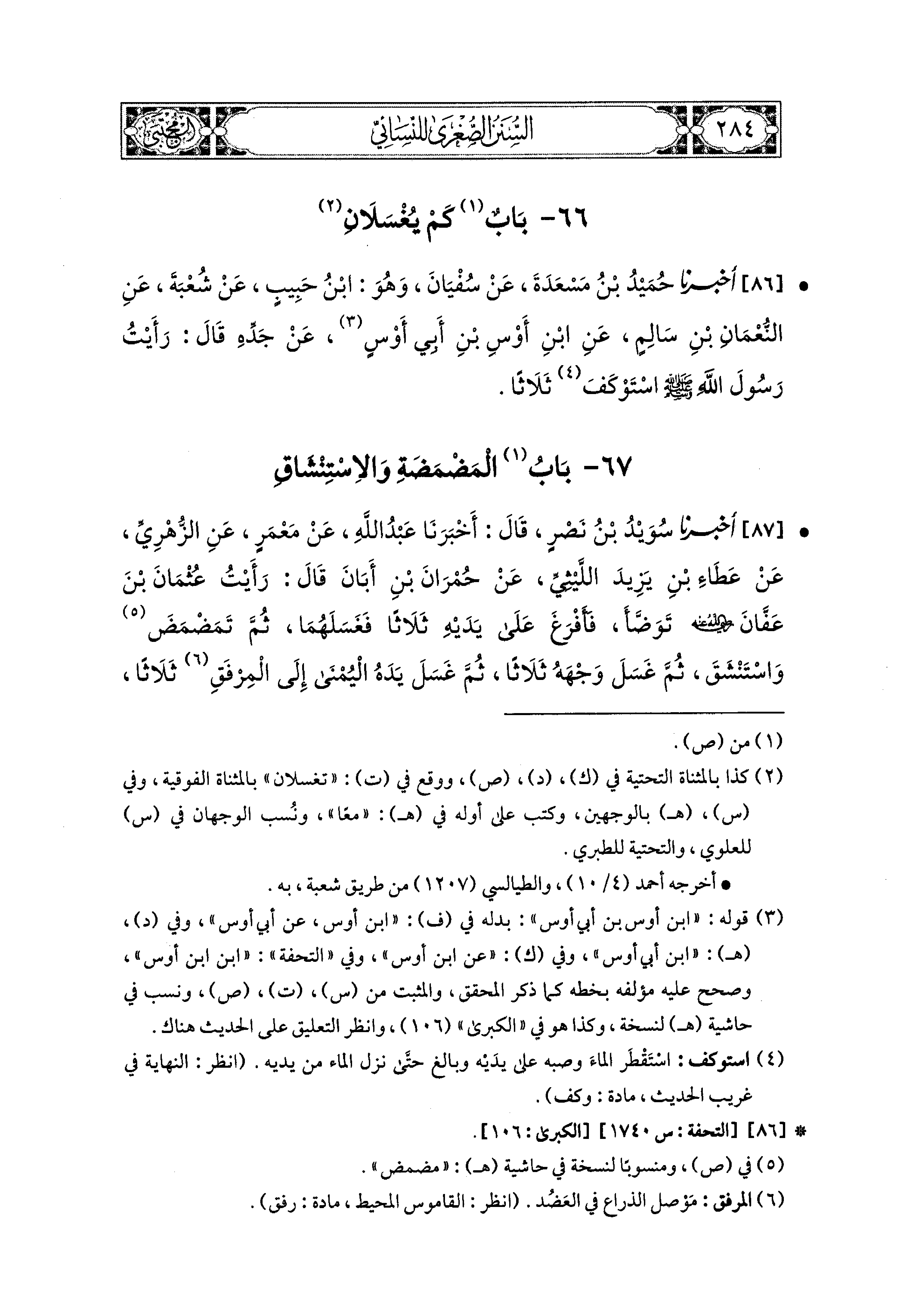 87- أخْبَرَنَا سُوَيْدُ بنُ نَصْرٍ، قَالَ: أخْبَرَنَا عَبدُ اللهِ، عَن مَعْمَرٍ، عَنِ الزُّهْرِيِّ، عَن عَطَاءِ بْنِ يَزِيدَ اللَّيْثِيِّ، عَن حُمْرَانَ بْنِ أَبَانَ قَالَ: رَأَيْتُ عُثْمَانَ بْنَ عَفَّانَ رَضِيَ اللهُ عَنهُ تَوَضَّأَ، فَأَفْرَغَ عَلَى يَدَيْهِ ثَلاَثًا فَغَسَلَهُمَا، ثُمَّ تَمَضْمَضَ وَاسْتَنْشَقَ، ثُمَّ غَسَلَ وَجْهَهُ ثَلاَثًا، ثُمَّ غَسَلَ يَدَه اليُمْنَى إِلَى المِرْفَقِ ثَلاَثًا، ثُمَّ اليُسْرَى مِثْلَ ذَلِكَ، ثُمَّ مَسَحَ بِرَأْسِهِ، ثُمَّ غَسَلَ قَدَمَهُ اليُمْنَى ثَلاَثًا، ثُمَّ اليُسْرَى مِثْلَ ذَلِكَ، ثُمَّ قَالَ: رَأَيْتُ رَسُولَ اللهِ صَلى الله عَليهِ وسَلم تَوَضَّأَ نَحْوَ وُضُوئِي، ثُمَّ قَالَ: مَنْ تَوَضَّأَ نَحْوَ وُضُوئِي هَذَا، ثُمَّ صَلَّى رَكْعَتَيْنِ لاَ يُحَدِّثُ نَفْسَهُ فِيهِمَا بِشَيْءٍ غُفِرَ لَهُ مَا تَقَدَّمَ مِنْ ذَنْبِهِ.