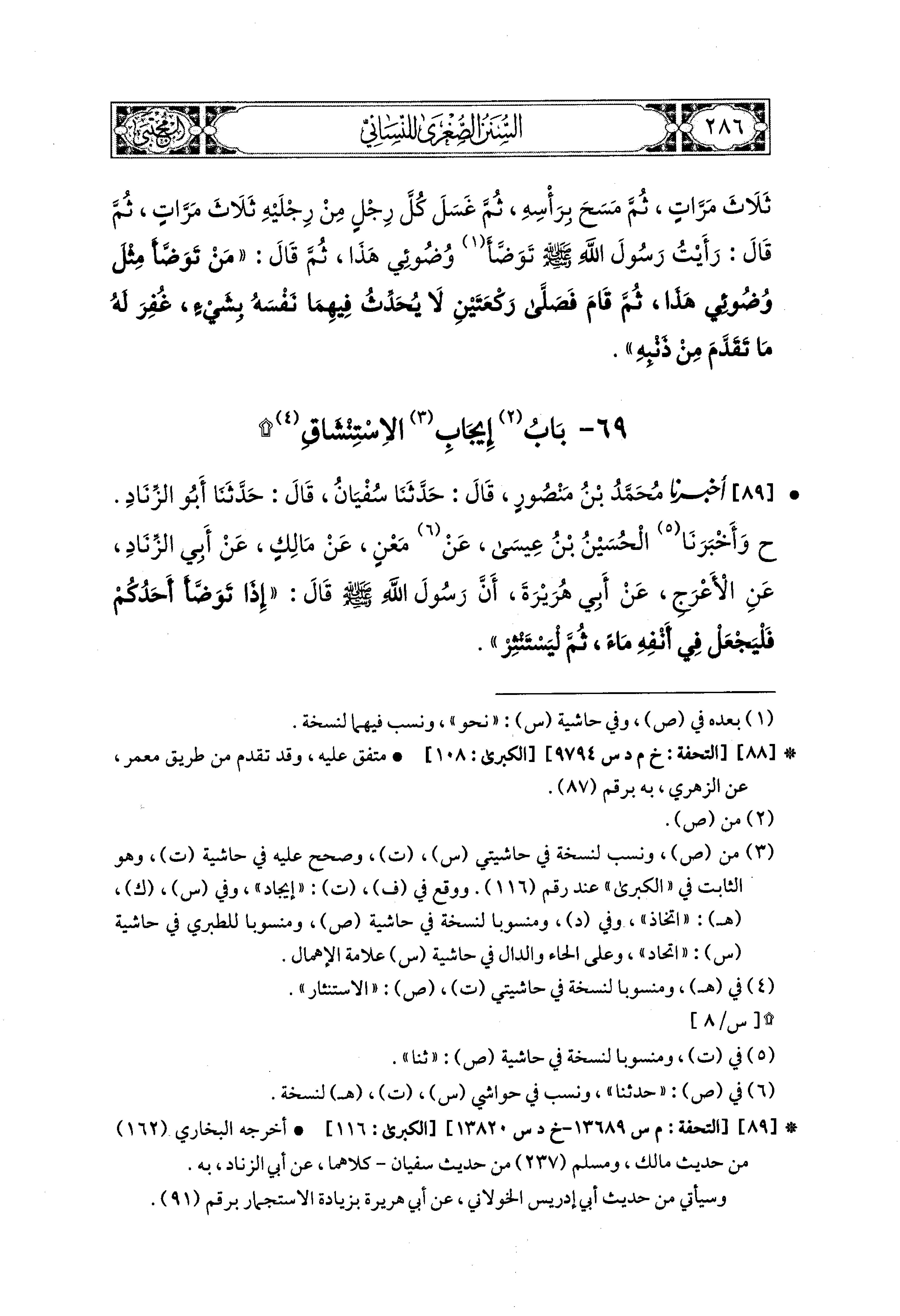 89- أَخبَرنا مُحَمد بنُ مَنْصُورٍ، قال: حَدَّثنا سُفيَانُ، قال: حَدَّثنا أَبُو الزِّنَادِ (ح) وَأَخبَرَنا الحُسَيْنُ بنُ عِيسَى، عَن مَعْنٍ، عَن مَالِكٍ، عَن أَبي الزِّنَادِ، عَنِ الأَعْرَجِ، عَن أَبي هُرَيرَةَ، أَنَّ رَسُولَ اللهِ صَلى الله عَليهِ وسَلم قَالَ: إِذَا تَوَضَّأَ أَحَدُكُمْ، فَلْيَجْعَلْ فِي أَنْفِهِ مَاءً، ثُمَّ لِيَسْتَنْثِرْ.