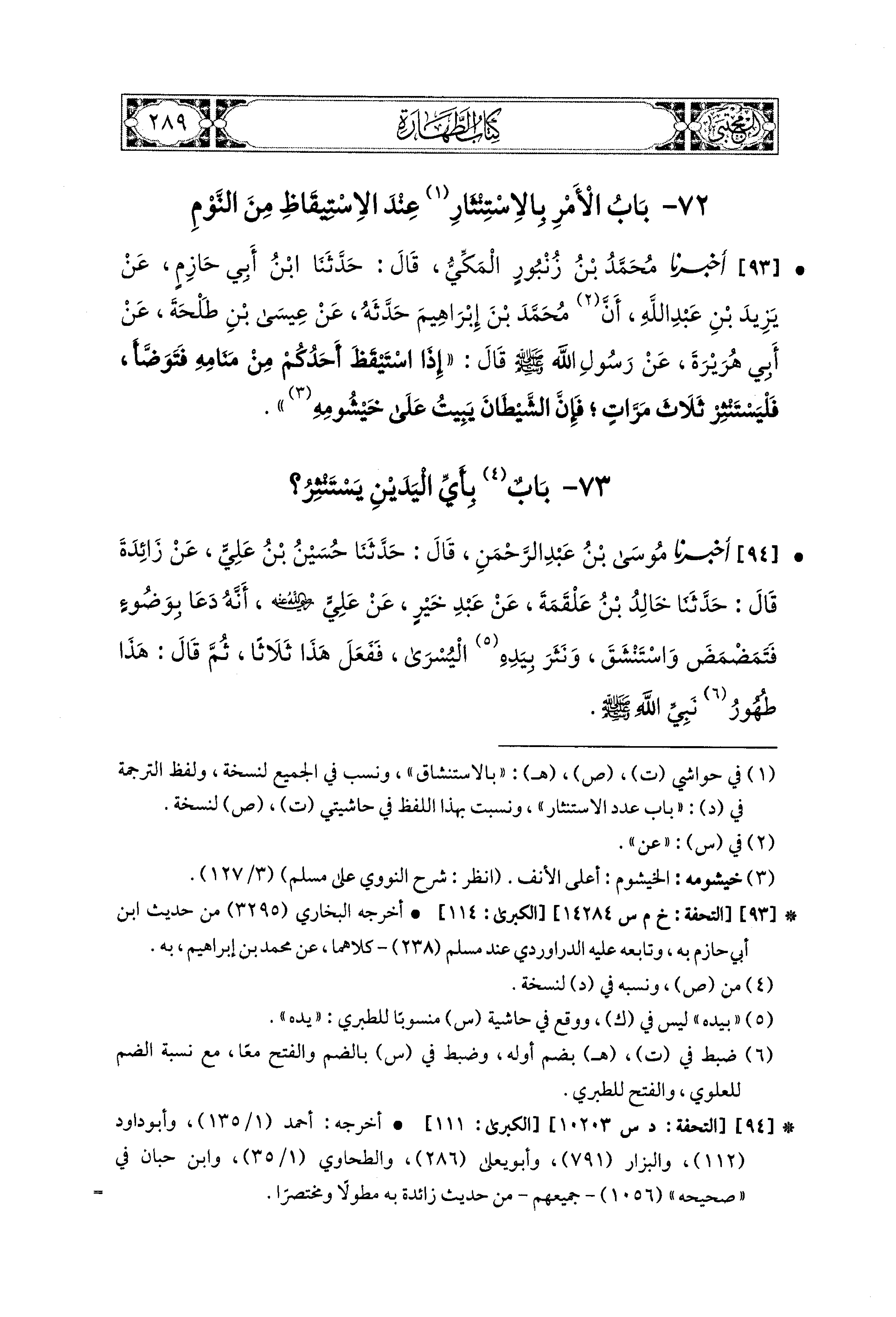 93- أَخبَرنا مُحَمد بنُ زُنْبُورٍ المَكِّيُّ، قال: حَدَّثنا ابنُ أَبي حَازِمٍ، عَن يَزِيدَ بْنِ عَبدِ اللهِ، أَنَّ مُحَمَّدَ بْنَ إِبرَاهيمَ حَدَّثَهُ، عَن عِيسَى بْنِ طَلْحَةَ، عَن أَبي هُرَيرَةَ، عَن رَسُولِ اللهِ صَلى الله عَليهِ وسَلم قَالَ: إِذَا اسْتَيْقَظَ أَحَدُكُمْ مِنْ مَنَامِهِ فَتَوَضَّأَ فَلْيَسْتَنْثِرْ ثَلاَثَ مَرَّاتٍ؛ فَإِنَّ الشَّيْطَانَ يَبِيتُ عَلَى خَيْشُومِهِ.