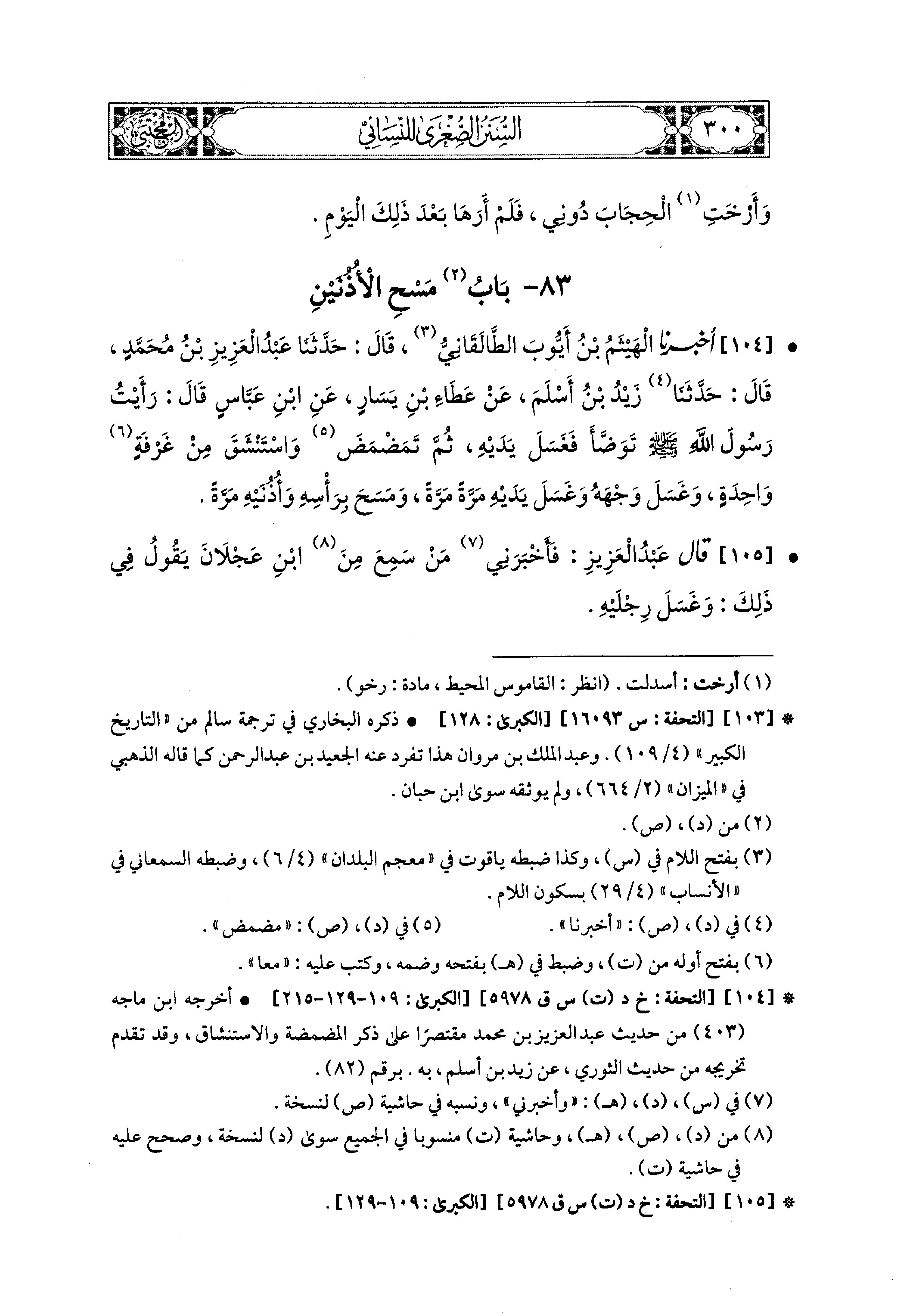 104- أَخبَرنا الهَيْثَمُ بنُ أَيُّوبَ الطَّالقَانِيُّ، قال: حَدَّثنا عَبدُ العَزِيزِ بنُ مُحَمَّدٍ، قال: حَدَّثنا زَيْدُ بنُ أَسْلَمَ، عَن عَطَاءِ بْنِ يَسَارٍ، عَنِ ابنِ عَبَّاسٍ، قَالَ: رَأَيْتُ رَسُولَ اللهِ صَلى الله عَليهِ وسَلم تَوَضَّأَ فَغَسَلَ يَدَيْهِ، ثُمَّ تَمَضْمَضَ وَاسْتَنْشَقَ مِنْ غَرْفَةٍ وَاحِدَةٍ، وَغَسَلَ وَجْهَهُ، وَغَسَلَ يَدَيْهِ مَرَّةً مَرَّةً، وَمَسَحَ بِرَأْسِهِ وَأُذُنَيْهِ مَرَّةً.