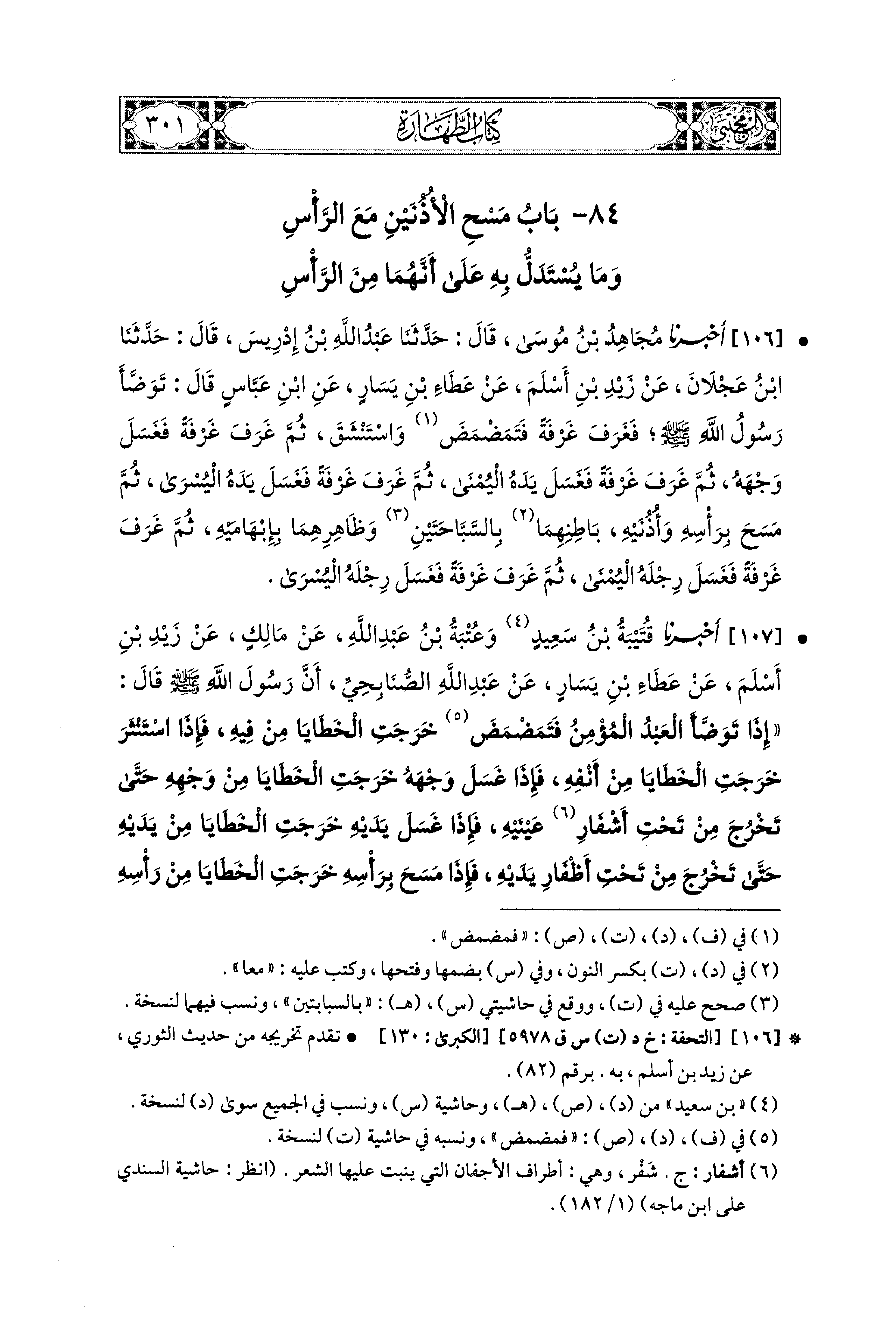 106- أَخبَرنا مُجَاهِدُ بنُ مُوسَى، قال: حَدَّثنا عَبدُ اللهِ بنُ إِدْرِيسَ، قال: حَدَّثنا ابنُ عَجْلاَنَ، عَن زَيْدِ بْنِ أَسْلَمَ، عَن عَطَاءِ بْنِ يَسَارٍ، عَنِ ابنِ عَبَّاسٍ، قَالَ: تَوَضَّأَ رَسُولُ اللهِ صَلى الله عَليهِ وسَلم فَغَرَفَ غَرْفَةً فَتمَضْمَضَ وَاسْتَنْشَقَ، ثُمَّ غَرَفَ غَرْفَةً فَغَسَلَ وَجْهَهُ، ثُمَّ غَرَفَ غَرْفَةً فَغَسَلَ يَدَهُ اليُمْنَى، ثُمَّ غَرَفَ غَرْفَةً فَغَسَلَ يَدَهُ اليُسْرَى، ثُمَّ مَسَحَ بِرَأْسِهِ وَأُذُنَيْهِ بَاطِنِهِمَا بِالسَّبَّاحَتَيْنِ وَظَاهِرِهِمَا بَإِبْهَامَيْهِ، ثُمَّ غَرَفَ غَرْفَةً فَغَسَلَ رِجْلَهُ اليُمْنَى، ثُمَّ غَرَفَ غَرْفَةً فَغَسَلَ رِجْلَهُ اليُسْرَى.