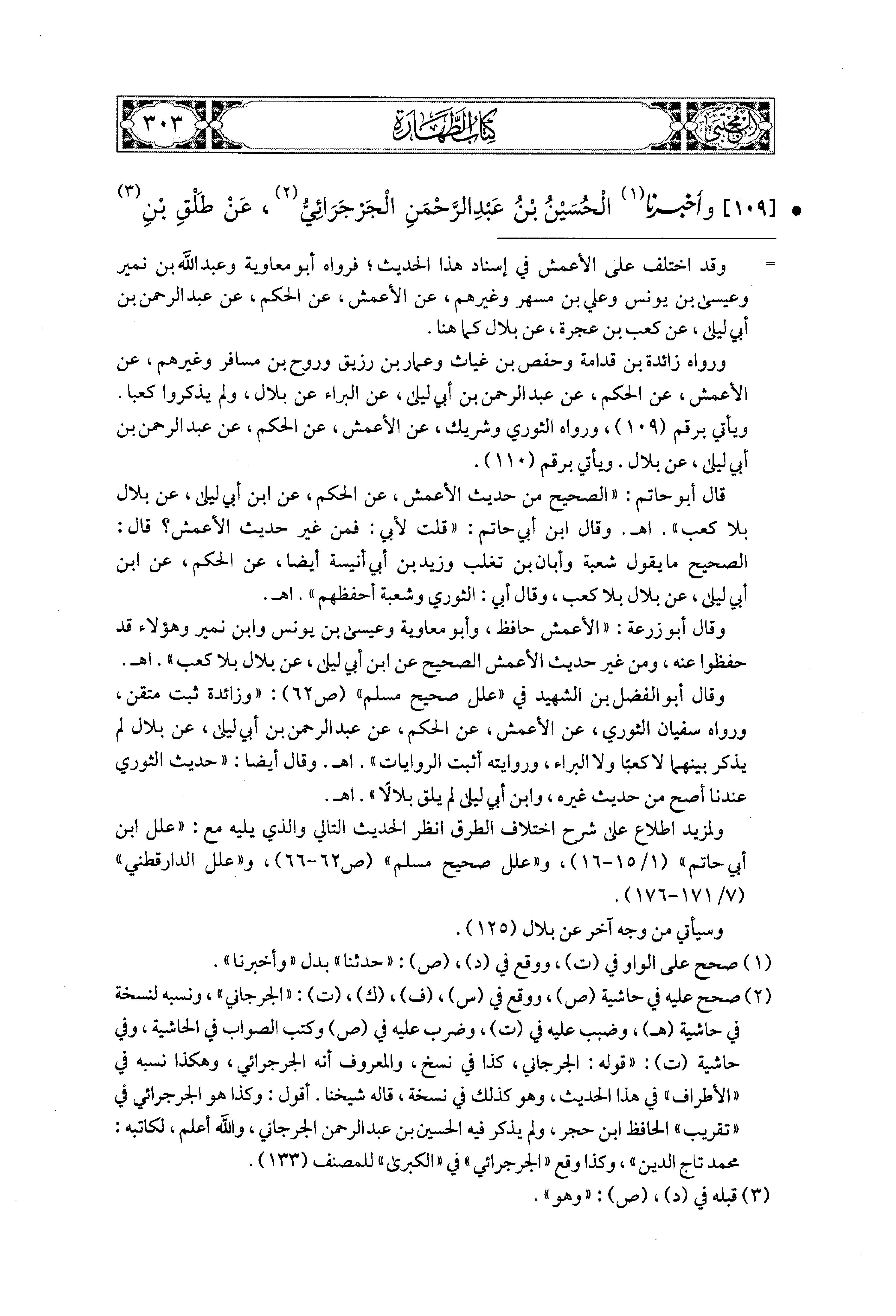 109- وَأَخبَرَنا الحُسَيْنُ بنُ عَبدِ الرَّحمَنِ الجَرْجَرَائِيُّ، عَن طَلْقِ بْنِ غَنَّامٍ، قال: حَدَّثنا زَائِدَةُ، وَحَفْصُ بنُ غِيَاثٍ، عَنِ الأَعْمَشِ، عَنِ الحَكَمِ، عَن عَبدِ الرَّحمَنِ بْنِ أَبي لَيْلَى، عَنِ البَرَاءِ بْنِ عَازِبٍ، عَن بِلاَلٍ قَالَ: رَأَيْتُ رَسُولَ اللهِ صَلى الله عَليهِ وسَلم يَمْسَحُ عَلَى الخُفَّيْنِ.