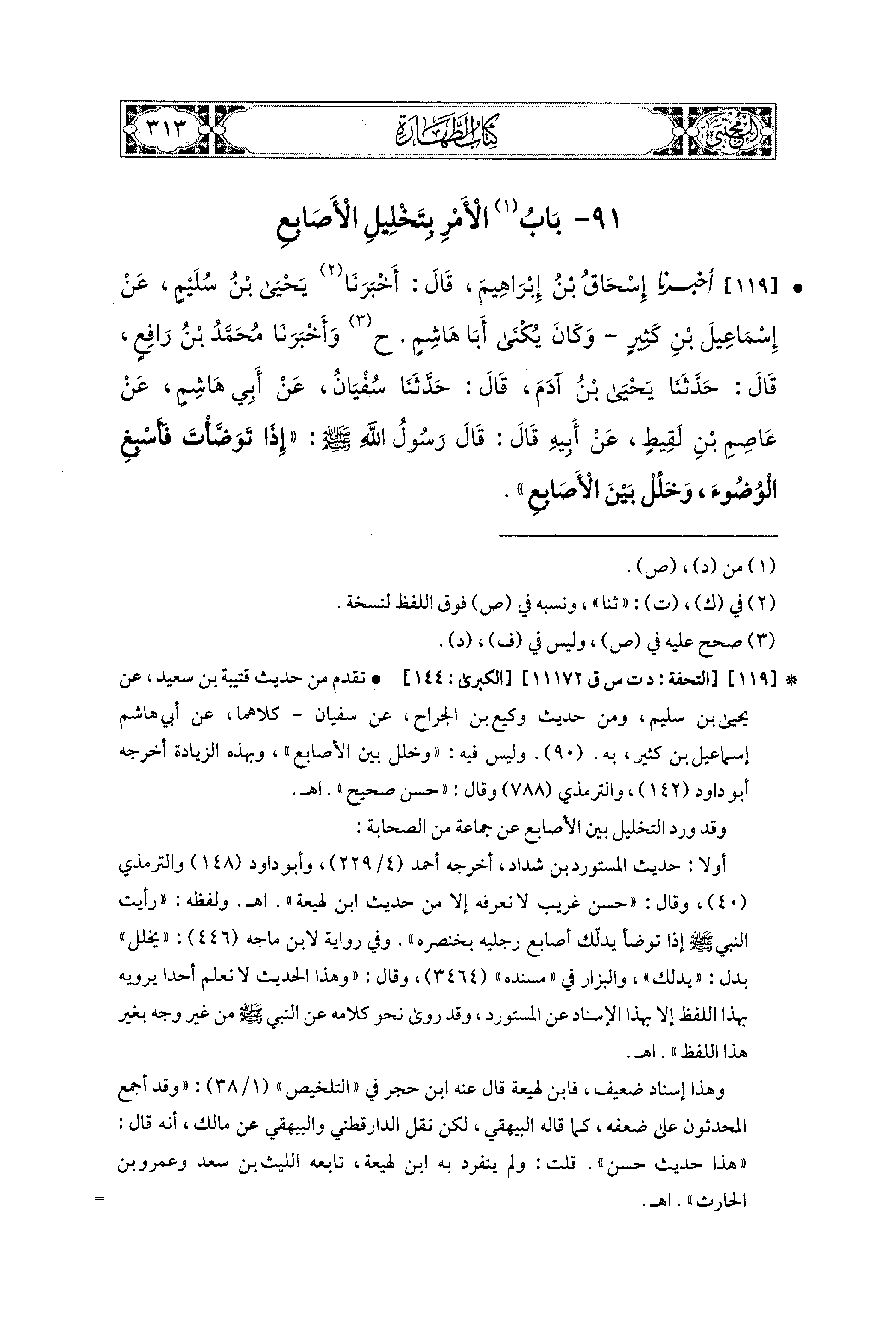 119- أَخبَرنا إِسْحَاقُ بنُ إِبرَاهيمَ، قَالَ: أَخبَرَنا يَحْيَى بنُ سُلَيْمٍ، عَن إِسماعِيلَ بْنِ كَثِيرٍ، وَكَانَ يُكْنَى أَبَا هَاشِمٍ (ح) وَأَخبَرَنا مُحَمَّدُ بنُ رَافِعٍ، قال: حَدَّثنا يَحْيَى بنُ آدَمَ، قال: حَدَّثنا سُفيَانُ، عَن أَبي هَاشِمٍ، عَن عَاصِمِ بْنِ لَقِيطٍ، عَن أَبيهِ، قَالَ: قَالَ رَسُولُ اللهِ صَلى الله عَليهِ وسَلم: إِذَا تَوَضَّأْتَ فَأَسْبِغِ الوُضُوءَ وَخَلِّلْ بَيْنَ الأَصَابِعِ.