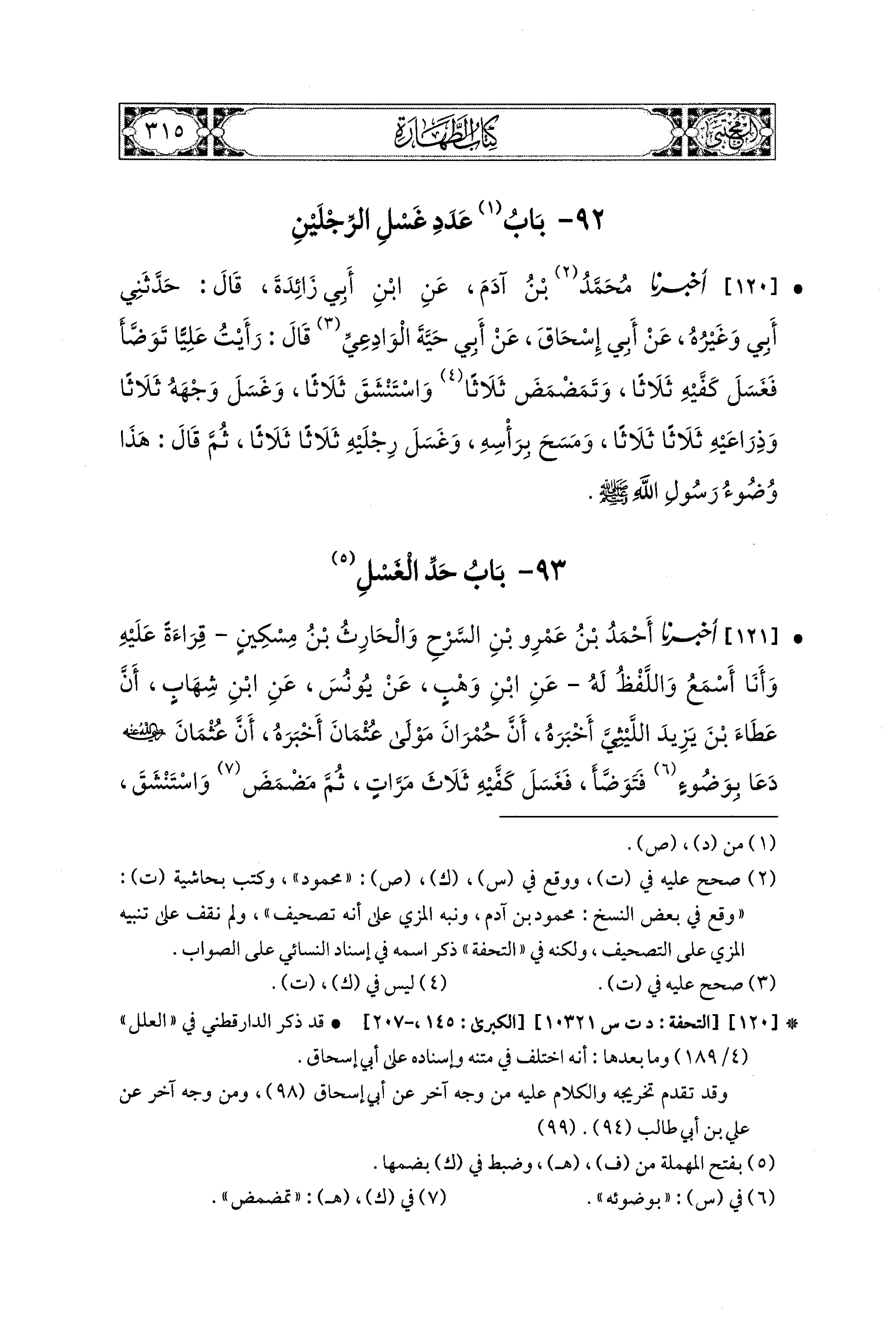 121- أََخْبَرَنَا أَحْمَدُ بنُ عَمْرِو بْنِ السَّرْحِ، وَالحَارِثُ بنُ مِسكينٍ، قِرَاءَةً عَلَيهِ وَأَنَا أَسْمَعُ، وَاللَّفْظُ لَهُ، عَنِ ابنِ وَهْبٍ، عَن يُونُسَ، عَنِ ابنِ شِهَابٍ، أَنَّ عَطَاءَ بْنَ يَزِيدَ اللَّيْثِيَّ، أَخْبَرَهُ أَنَّ حُمْرَانَ مَوْلَى عُثْمَانَ أَخْبَرَهُ؛ أَنَّ عُثْمَانَ رَضِيَ اللهُ عَنهُ دَعَا بِوَضُوءٍ فَتَوَضَّأَ فَغَسَلَ كَفَّيْهِ ثَلاَثَ مَرَّاتٍ، ثُمَّ مَضْمَضَ وَاسْتَنْشَقَ، ثُمَّ غَسَلَ وَجْهَهُ ثَلاَثَ مَرَّاتٍ، ثُمَّ غَسَلَ يَدَهُ اليُمْنَى إِلَى المِرْفَقِ ثَلاَثَ مَرَّاتٍ، ثُمَّ غَسَلَ يَدَهُ اليُسْرَى مِثْلَ ذَلِكَ، ثُمَّ مَسَحَ بِرَأْسِهِ، ثُمَّ غَسَلَ رِجْلَهُ اليُمْنَى إِلَى الكَعْبَيْنِ ثَلاَثَ مَرَّاتٍ، ثُمَّ غَسَلَ رِجْلَهُ اليُسْرَى مِثْلَ ذَلِكَ، ثُمَّ قَالَ: رَأَيْتُ رَسُولَ اللهِ صَلى الله عَليهِ وسَلم تَوَضَّأَ نَحْوَ وُضُوئِي هَذَا، ثُمَّ قَالَ: قَالَ رَسُولُ اللهِ صَلى الله عَليهِ وسَلم: مَنْ تَوَضَّأَ نَحْوَ وُضُوئِي هَذَا ثُمَّ قَامَ فَرَكَعَ رَكْعَتَيْنِ لاَ يُحَدِّثُ فِيهِمَا نَفْسَهُ غُفِرَ لَهُ مَا تَقَدَّمَ مِنْ ذَنْبِهِ.
