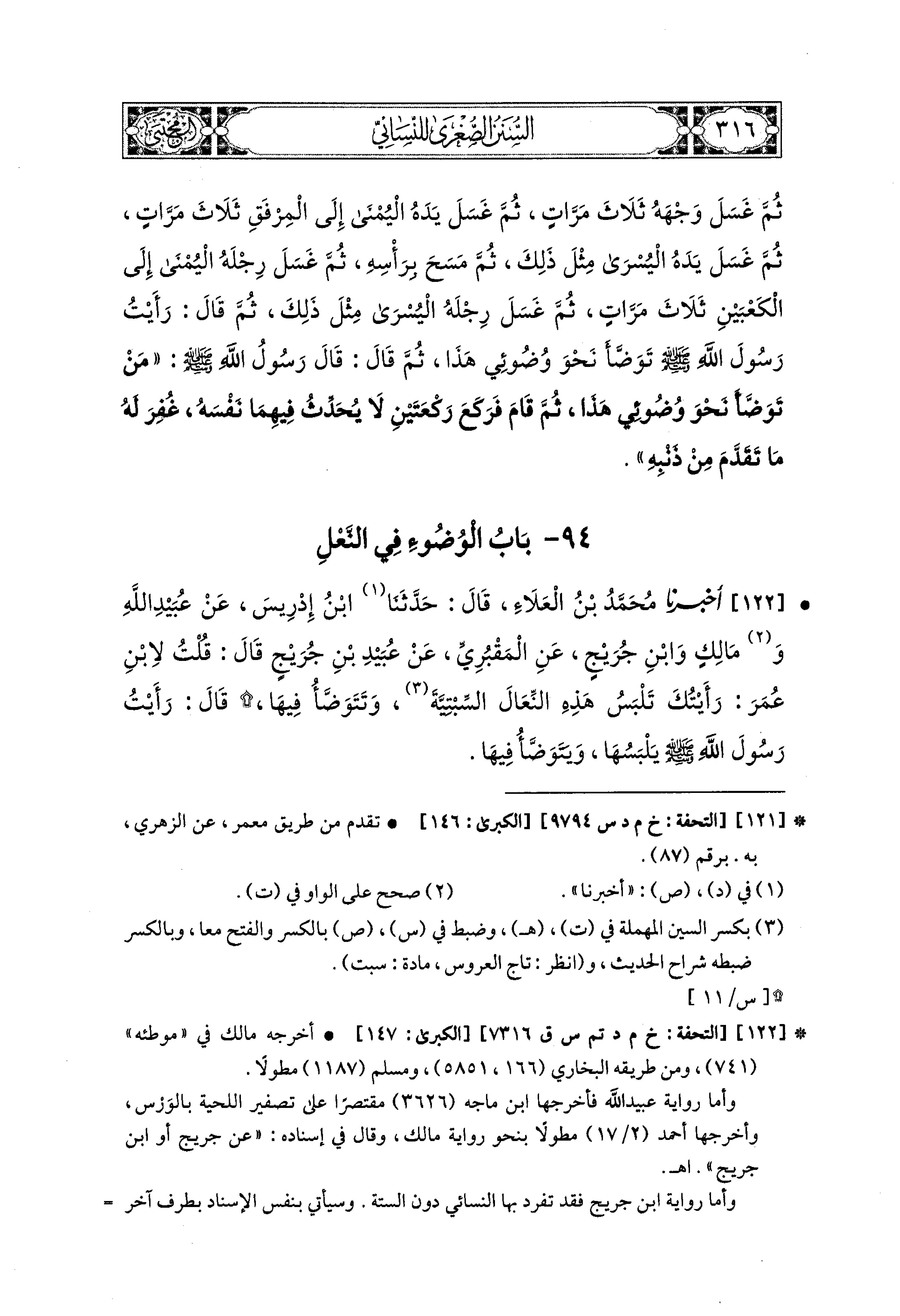 122- أَخبَرنا مُحَمد بنُ العَلاَءِ، قال: حَدَّثنا ابنُ إِدْرِيسَ، عَن عُبَيدِ اللهِ، وَمَالِكٍ، وَابنِ جُرَيْجٍ، عَنِ المَقْبُرِيِّ، عَن عُبَيدِ بْنِ جُرَيْجٍ، قَالَ: قُلْتُ لاِبْنِ عُمَرَ: رَأَيْتُكَ تَلْبَسُ هَذِهِ النِّعَالَ السِّبْتِيَّةَ وَتَتَوَضَّأُ فِيهَا، قَالَ: رَأَيْتُ رَسُولَ اللهِ صَلى الله عَليهِ وسَلم يَلْبَسُهَا وَيَتَوَضَّأُ فِيهَا.