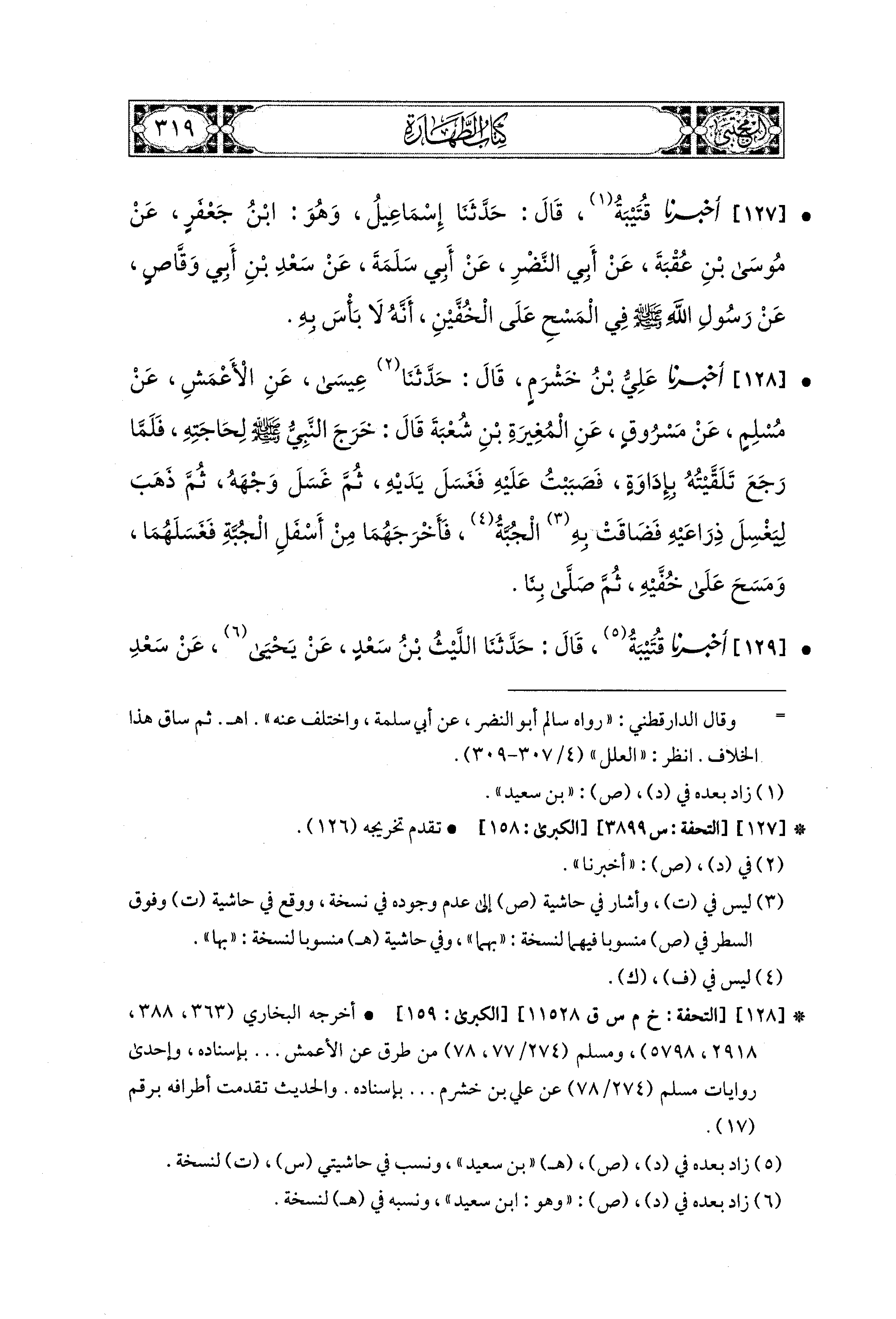 127- أَخبَرنا قُتَيبَةُ، قال: حَدَّثنا إِسماعِيلُ، وَهُوَ ابنُ جَعْفَرٍ، عَن مُوسَى بْنِ عُقْبَةَ، عَن أَبي النَّضْرِ، عَن أَبي سَلَمَةَ، عَن سَعْدِ بْنِ أَبي وَقَّاصٍ، عَن رَسُولِ اللهِ صَلى الله عَليهِ وسَلم: فِي المَسْحِ عَلَى الخُفَّيْنِ أَنَّهُ لاَ بَأْسَ بِهِ.
