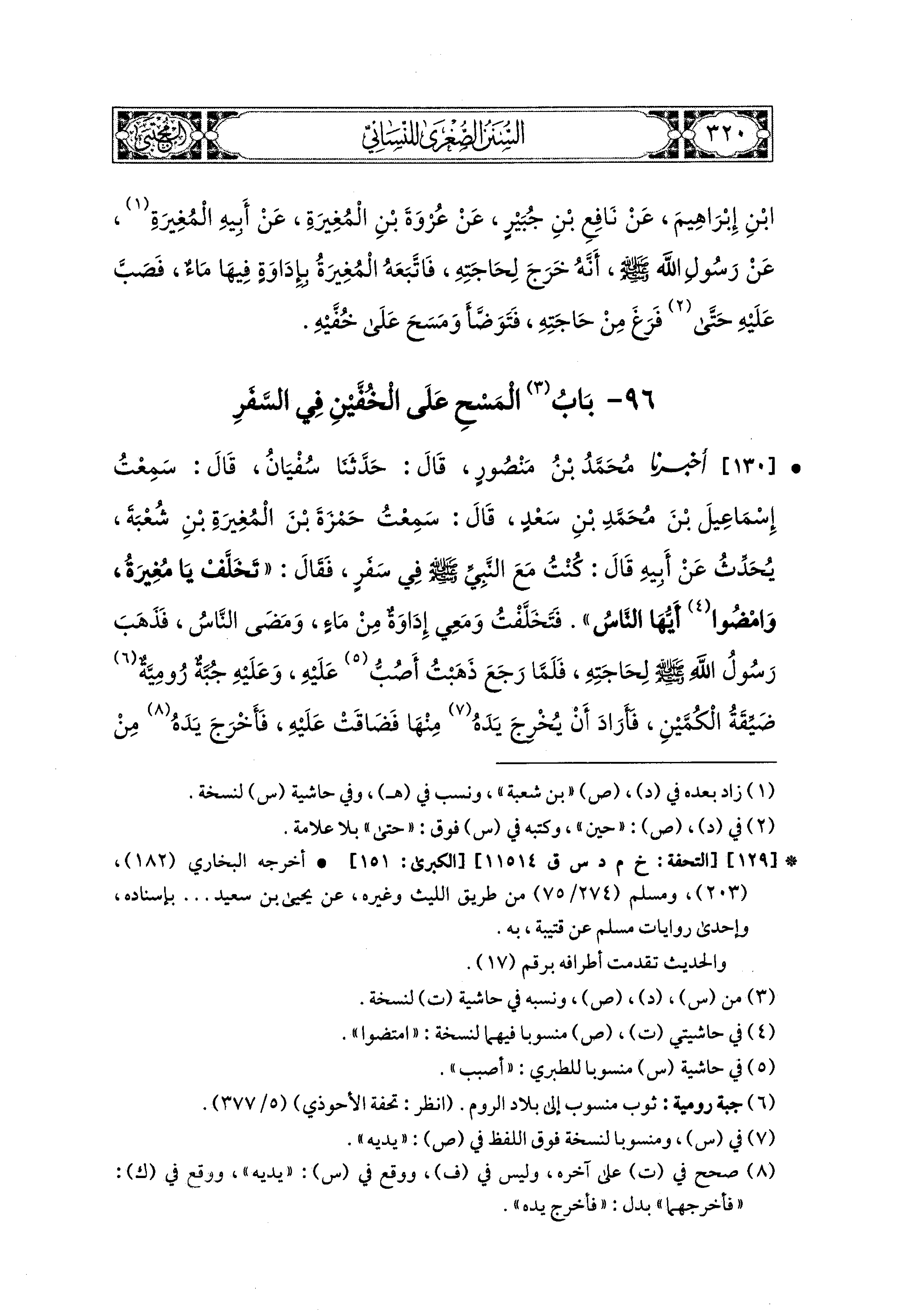 130- أَخبَرنا مُحَمد بنُ مَنْصُورٍ، قال: حَدَّثنا سُفيَانُ، قَالَ: سَمِعْتُ إِسماعِيلَ بْنَ مُحَمَّدِ بْنِ سَعْدٍ، قَالَ: سَمِعْتُ حَمْزَةَ بْنَ المُغِيرَةِ بْنِ شُعبَةَ يُحَدِّثُ، عَن أَبيهِ، قَالَ: كُنْتُ مَعَ النَّبيِّ صَلى الله عَليهِ وسَلم فِي سَفَرٍ فَقَالَ: تَخَلَّفْ يَا مُغِيرَةُ وَامْضُوا أَيُّهَا النَّاسُ، فَتَخَلَّفْتُ وَمَعِي إِدَاوَةٌ مِنْ مَاءٍ وَمَضَى النَّاسُ، فَذَهَبَ رَسُولُ اللهِ صَلى الله عَليهِ وسَلم لِحَاجَتِهِ، فَلَمَّا رَجَعَ ذَهَبْتُ أَصُبُّ عَلَيهِ، وَعَلَيهِ جُبَّةٌ رُوميَّةٌ ضَيِّقَةُ الكُمَّيْنِ، فَأَرَادَ أَنْ يُخْرِجَ يَدَهُ مِنْهَا فَضَاقَتْ عَلَيهِ، فَأَخْرَجَ يَدَهُ مِنْ تَحْتِ الجُبَّةِ فَغَسَلَ وَجْهَهُ وَيَدَيْهِ، وَمَسَحَ بِرَأْسِهِ، وَمَسَحَ عَلَى خُفَّيْه.