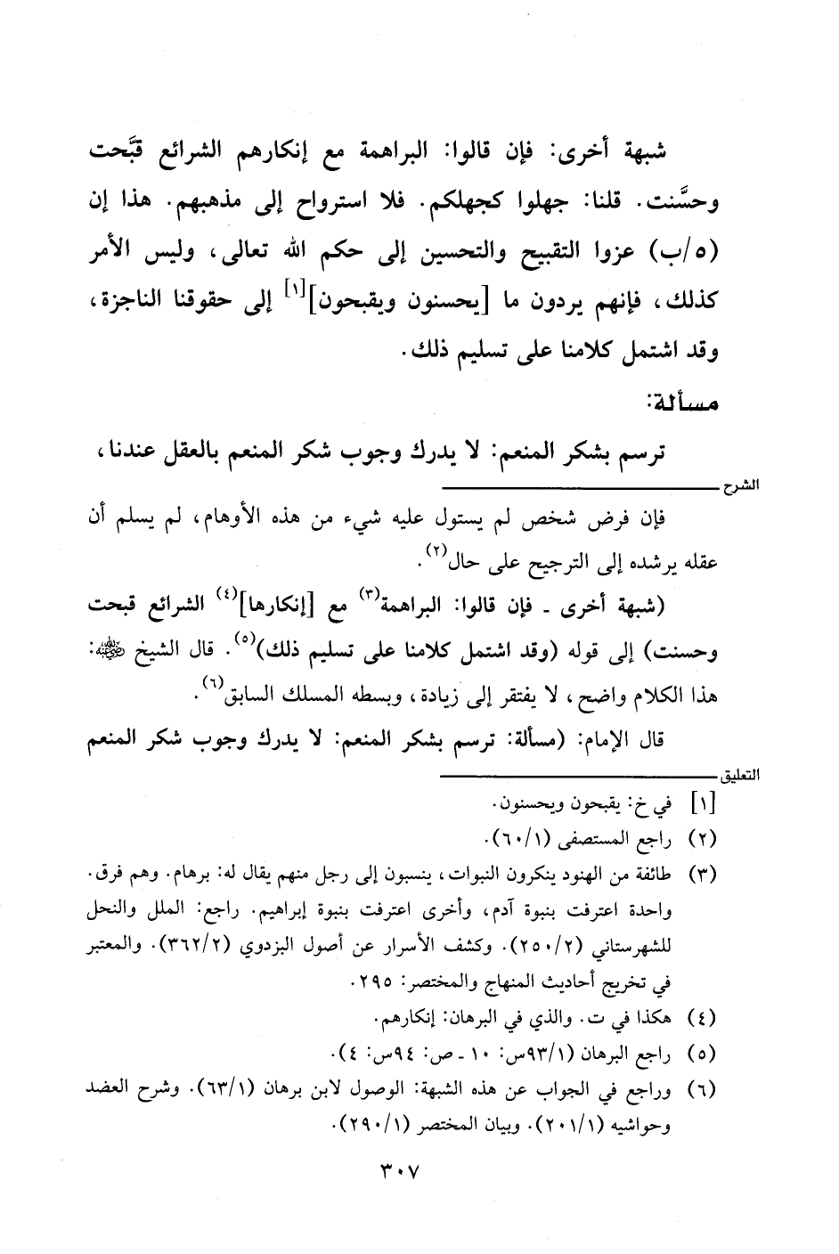 (شبهة أخرى- فإن قالوا: البراهمة مع [إنكارها] الشرائع قبحت وحسنت) إلى قوله (وقد اشتمل كلامنا على تسليم ذلك). قال الشيخ - رضي الله عنه -: هذا الكلام واضح، لا يفتقر إلى زيادة، وبسطه المسلك السابق.