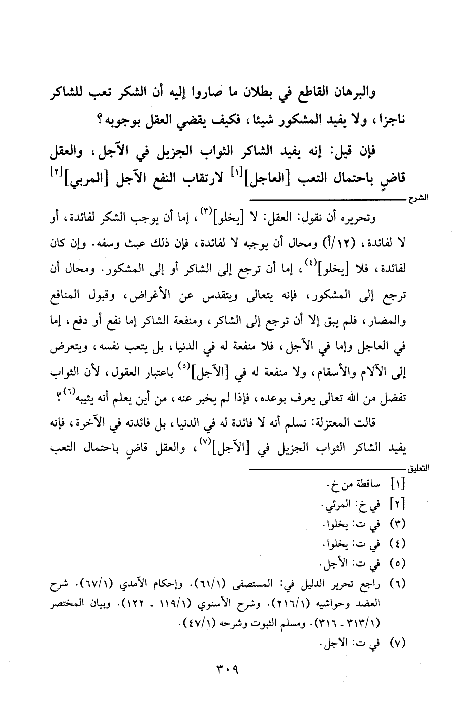 وتحريره أن نقول: لا [يخلو]، إما أن يوجب الشكر لفائدة، أو لا لفائدة، (١٢/أ) ومحال أن يوجبه لا لفائدة، فإن ذلك عبث وسفه. وإن كان لفائدة، فلا [يخلو]، إما أ، ترجع إلى الشاكر أو إلى المشكور. ومحال أن ترجع إلى المشكور، فإنه يتعالى ويتقدس عن الأغراض، وقبول المنافع والمضار، فلم يبق إلا أن ترجع إلى الشاكر، ومنفعة الشاكر إما نفع أو دفع، إما في العاجل وإما في الآجل، فلا منفعة له في الدنيا، بل يتعب نفسه، ويتعرض إلى الآلام والأسقام، ولا منفعة له في [الآجل] باعتبار العقول، لأن الثواب تفضل من الله تعالى يعرف بوعده، فإذا لم يخبر عنه، من أين يعلم أنه يثيبه؟
