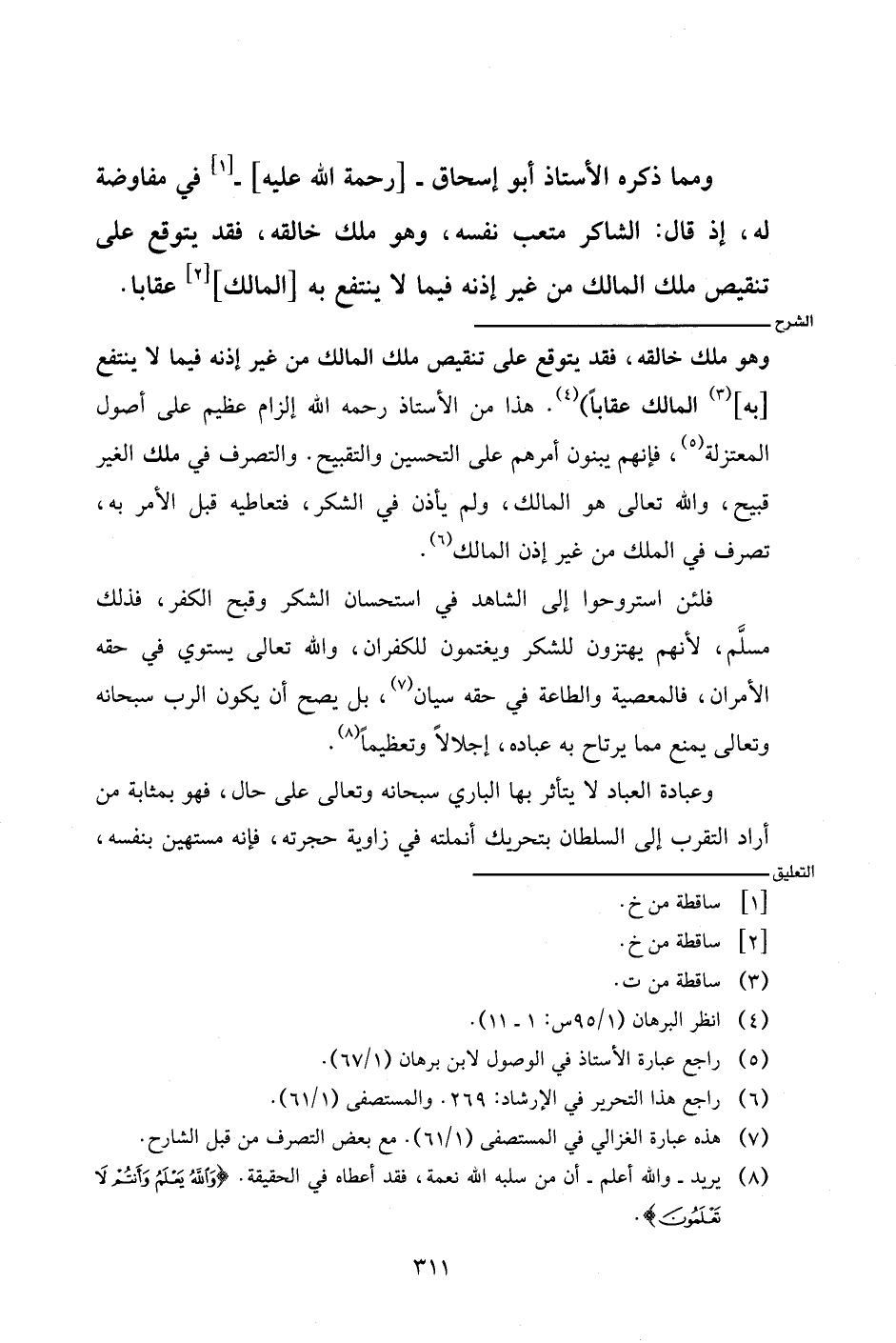 وهو ملك خالقه، فقد يتوقع على تنقيص ملك المالك من غير إذنه فيما لا ينتفع [به] المالك عقابا). هذا من الأستاذ رحمه الله إلزام عظيم على أصول المعتزلة، فإنهم يبنون أمرهم على التحسين والتقبيح. والتصرف في ملك الغير قبيح، والله تعالى هو المالك، ولم يأذن في الشكر، فتعاطيه قبل الأمر به، تصرف في الملك من غير إذن المالك.