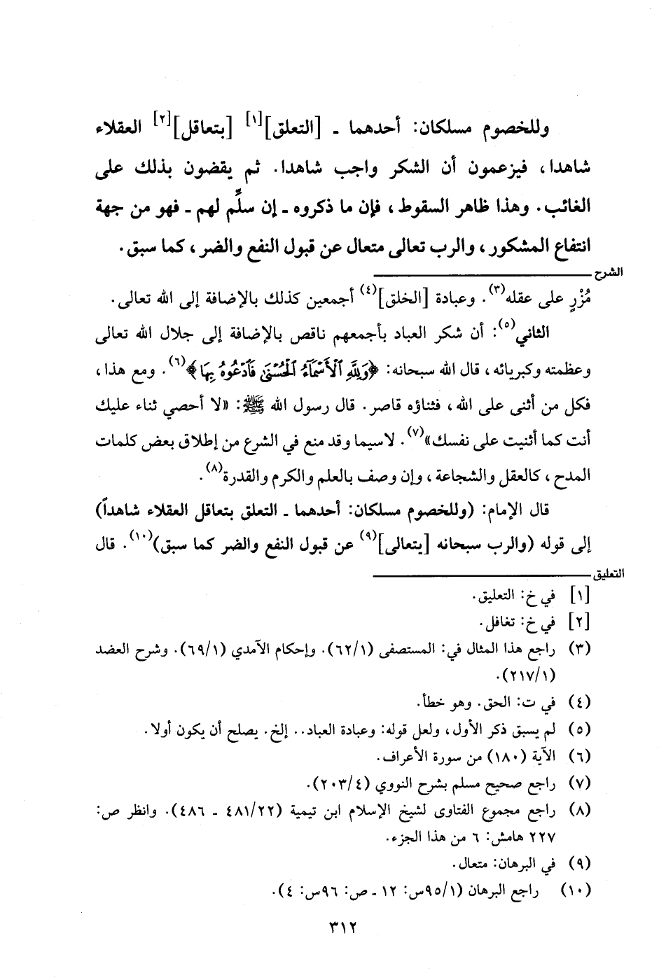 قال الإمام: (وللخصوم مسلكان: أحدهما- التعلق بتعاقل العقلاء شاهدا) إلى قوله (والرب سبحانه [يتعالى] عن قبول النفع والضر كما سبق). قال