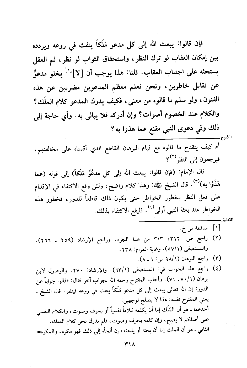 قال الإمام: (فإن قالوا: يبعث الله إلى كل مدعو ملكا) إلى قوله (عما هذوا به). قال الشيخ - رضي الله عنه -: وهذا كلام واضح، ولئن وقع الاكتفاء في الإقدام على فعل النظر بخطور الخواطر حتى يكون ذلك قاطعا للدور، فخطور هذه الخواطر عند بعثة النبي أولى. فليقع الاكتفاء بذلك.