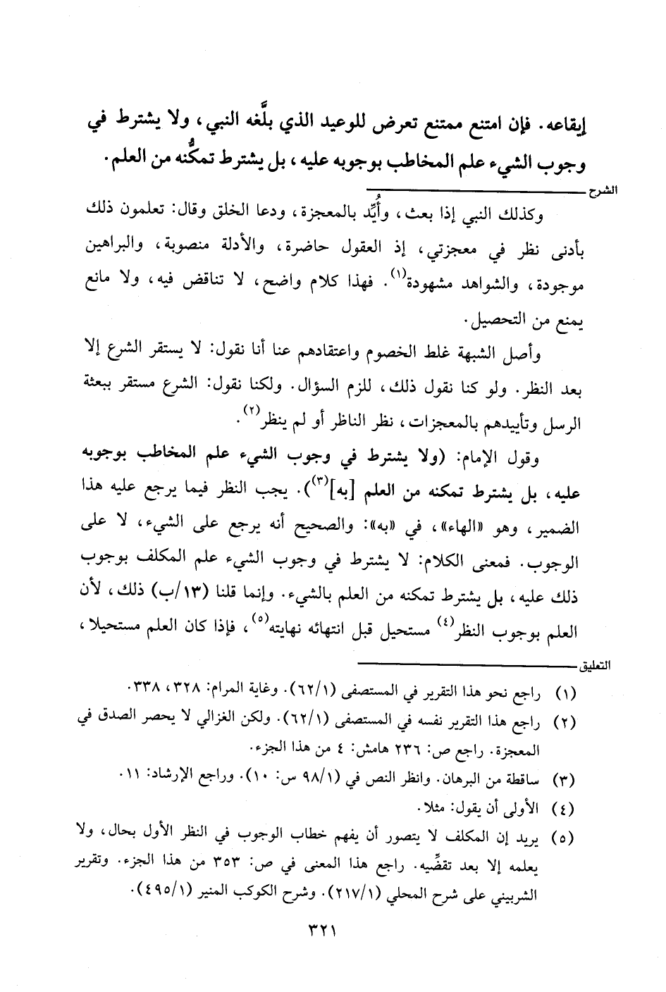 وقول الإمام: (ولا يشترط في وجوب الشيء علم المخاطب بوجوبه عليه، بل يشترط تمكنه من العلم [به]). يجب النظر فيما يرجع عليه هذا الضمير، وهو (الهاء)، في (به): والصحيح أنه يرجع على الشيء، لا على الوجوب. فمعنى الكلام: لا يشترط في وجوب الشيء علم المكلف بوجوب ذلك عليه، بل يشترط تمكنه من العلم بالشيء. وإنما قلنا (١٣/ب) ذلك، لأن العلم بوجوب النظر مستحيل قبل انتهائه نهايته، فإذا كان العلم مستحيلا،