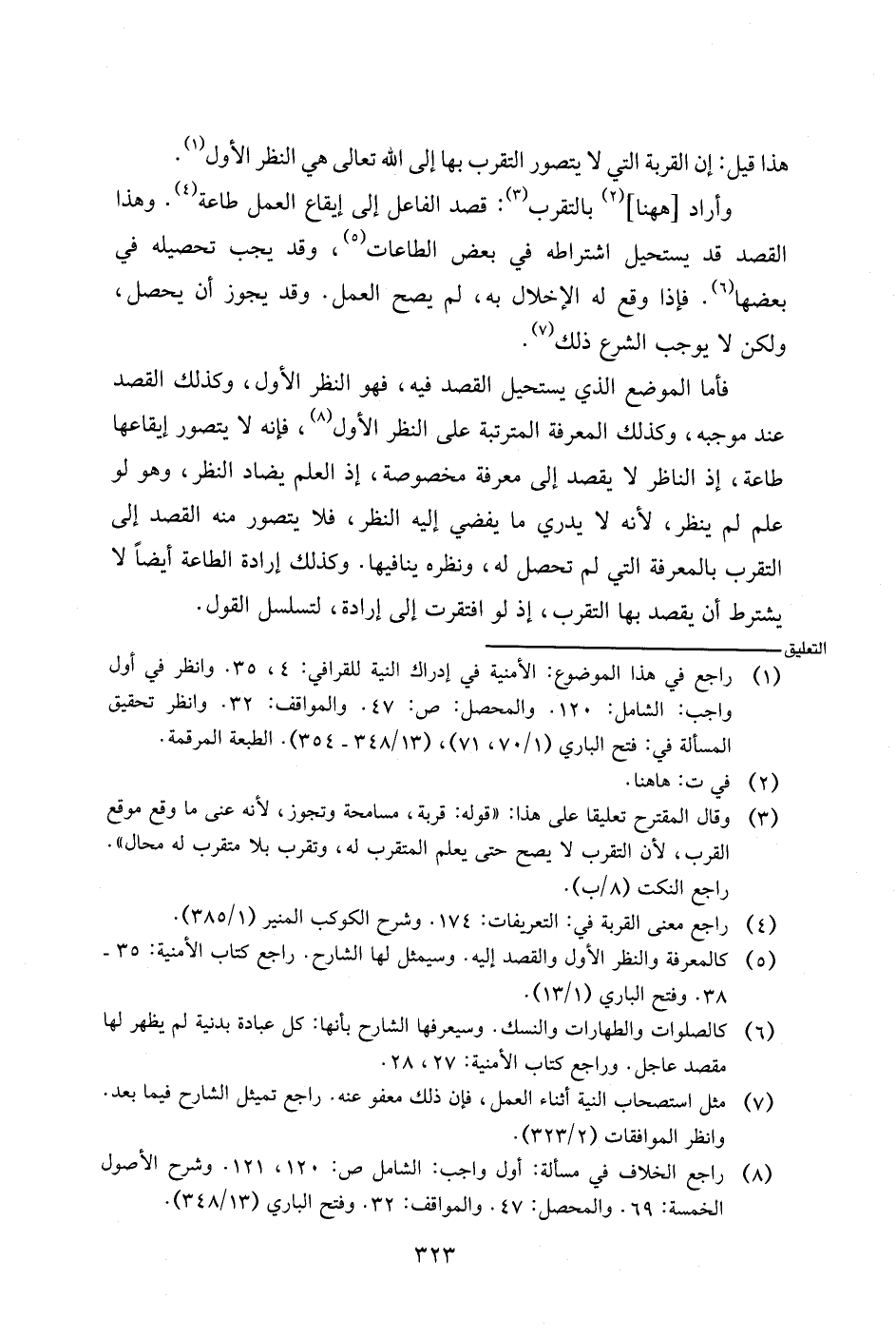 فأما الموضع الذي يستحيل القصد فيه، فهو النظر الأول، وكذلك القصد عند موجبه، وكذل المعرفة المترتبة على النظر الأول، فإنه لا يتصور إيقاعها طاعة، إذ الناظر لا يقصد إلى معرفة مخصوصة، إذ العلم يضاد النظر، وهو لو علم لم ينظر، لأنه لا يدري ما يفضي إليه النظر، فلا يتصور منه القصد إلى التقرب بالمعرفة التي لم تحصل له، ونظره ينافيها. وكذلك إدارة الطاعة أيضا لا يشترط أن يقصد بها التقرب، غذ لو افتقرت إلى إرادة، لتسلسل القول.