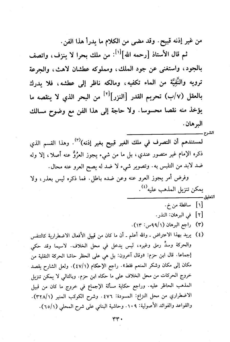 لمستندهم أن التصرف في ملك الغير قبيح بغير إذنه). وهذا القسم الذي ذكره الإمام غير متصور عندي، بل ما من شيء يجوز العرو عنه أصلا، إلا وله ضد لابد من التلبس به. وتصوير شيء لا ضد له يصح العرو عنه محال.