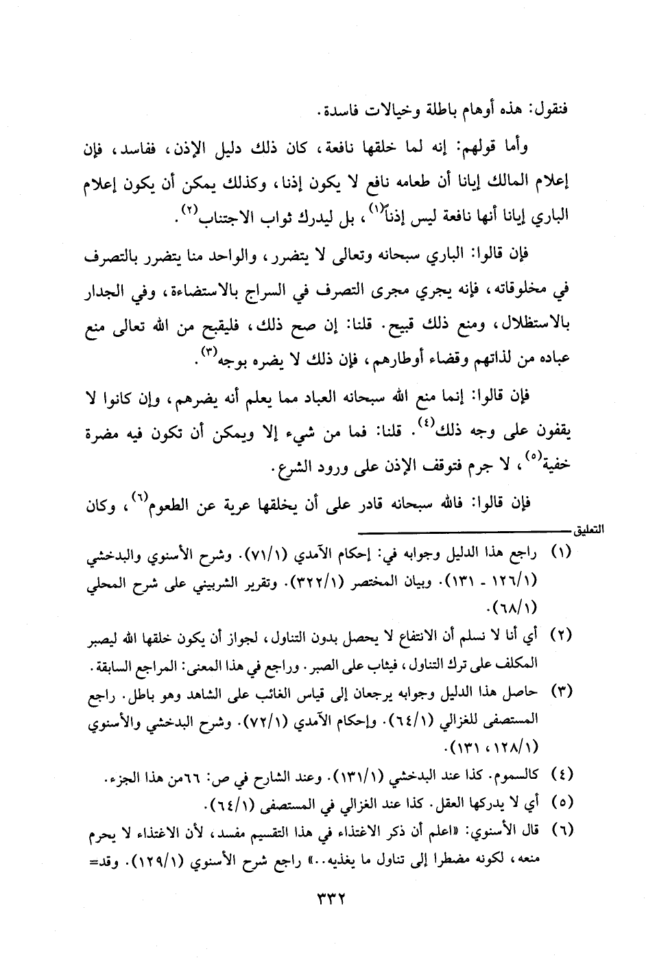 فإن قالوا: الباري سبحانه وتعالى لا يتضرر، والواحد منا يتضرر بالتصرف في مخلوقاته، فإنه يجري مجرى التصرف في السراج بالاستضاءة، وفي الجدار بالاستظلال، ومنع ذلك قبيح. قلنا: إن صح ذلك، فليقبح من الله تعالى منع عباده من لذاتهم وقضاء أوطارهم، فإن ذلك لا يضره بوجه.