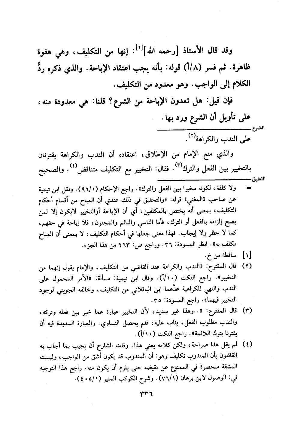 والذي منع الإمام من الإطلاق، اعتقاده أن الندب والكراهة يقترنان بالتخيير بين الفعل والترك. فقال: التخيير مع التكليف متناقض. والصحيح