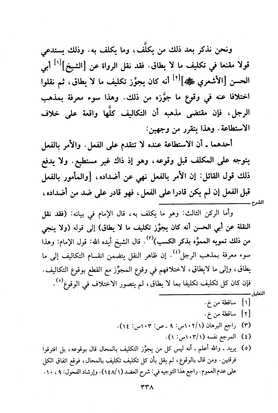 وأما الركن الثالث: وهو ما يكلف به، قال الإمام في بيانه: (فقد نقل النقلة عن أبي الحسن أنه كان يجوز تكليف ما لا يطاق) إلى قوله (ولا ينجي من ذلك تمويه المموه بذكر الكسب). قال الشيخ أيده الله: قول الإمام: وهذا سوء معرة بمذهب الرجل. إن ظاهر النقل يتضمن انقسام التكاليف إلى ما يطاق، وإلى ما لا يطاق، لاختلافهم في وقوع المجوز مع القطع بوقوع التكاليف. فإن كان كل تكليف تكليفا بما لا يطاق، لم يتصور الاختلاف في الوقوع.