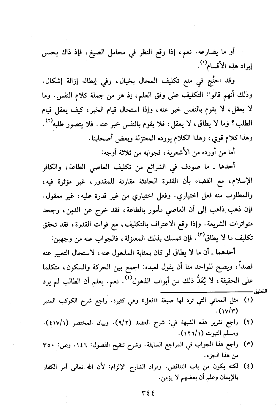 أحدها- ما صودف في الشرائع من تكليف العاصي الطاعة، والكافر الإسلام، مع القضاء بأن القدرة الحادثة مقارنة للمقدور، غير مؤثرة فيه، والمطلوب منه فعل اختياري. وفعل اختياري من غير قدرة عليه، غير معقول. فإن ذهب ذاهب إلى أن العاصي مأمور بالطاعة، فقد خرج عن الدين، وجحد متواترات الشريعة. وإذا وقع الاعتراف بالتكليف، مع فوات القدرة، فقد تحقق تكليف ما لا يطاق. فإن تمسك بذلك المعتزلة، فالجواب عنه من وجهين: