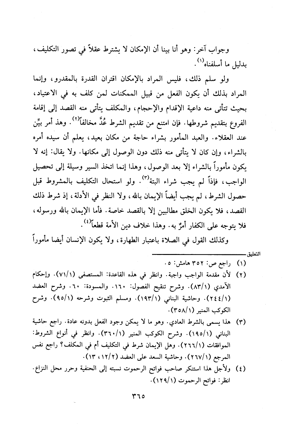 ولو سلم ذلك، فليس المراد بالإمكان اقتران القدرة بالمقدور، وإنما المراد بذلك أن يكون الفعل من قبيل الممكنات لمن كلف به في الاعتياد، بحيث تتأتى منه داعية الإقدام والإحجام، والمكلف يتأتى منه القصد إلى إقامة الفروع بتقديم شروطها. فإن امتنع من تقديم الشرط عد مخالفا. وهذا أمر بين عند العقلاء. والعبد المأمور بشراء حاجة من مكان بعيد، يعلم أن سيده أمره بالشراء، وإن كان لا يتأتى منه ذلك دون الوصول إلى مكانها. ولا يقال: إنه لا يكون مأمورا بالشراء إلا بعد الوصول، وهذا إنما اتخذ السير وسيلة إلى تحصيل الواجب، فإذا لم يجب شراء البتة. ولو استحال التكليف بالمشروط قبل حصول الشرط، لم يجب أيضا الإيمان بالله، ولا النظر في الأدلة، إذ شرط ذلك القصد، فلا يكون الخلق مطالبين إلا بالقصد خاصة. فأما الإيمان بالله ورسوله، فلا يتوجه على الكفار أمر به. وهذا خلاف دين الأمة قطعا.