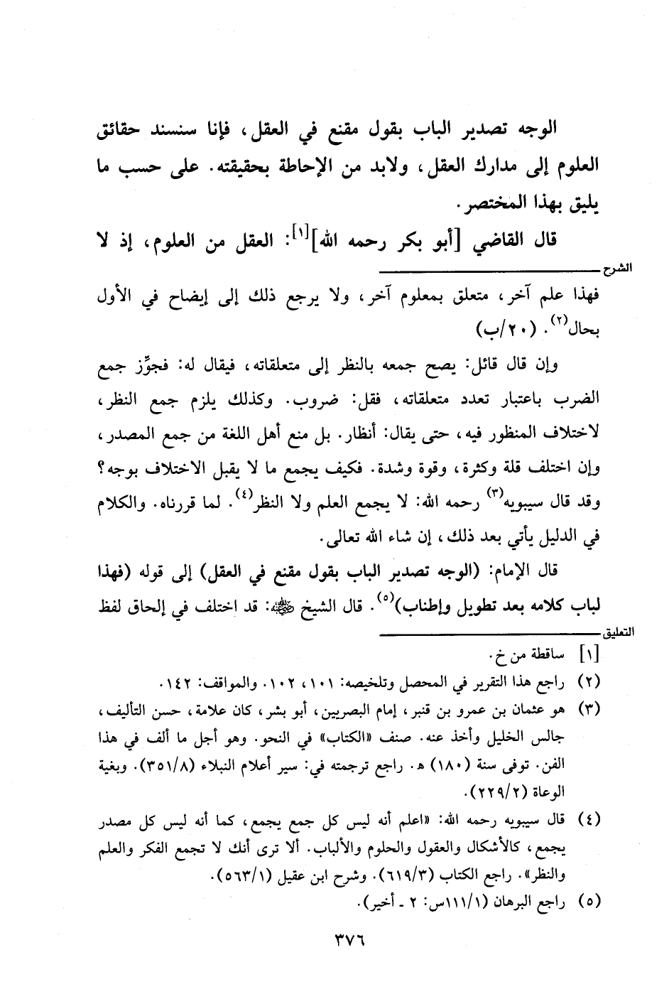 قال الإمام: (الوجه تصدير الباب بقول مقنع في العقل) إلى قوله (فهذا لباب كلامه بعد تطويل وإطناب). قال الشيخ - رضي الله عنه -: قد اختلف في إلحاق لفظ