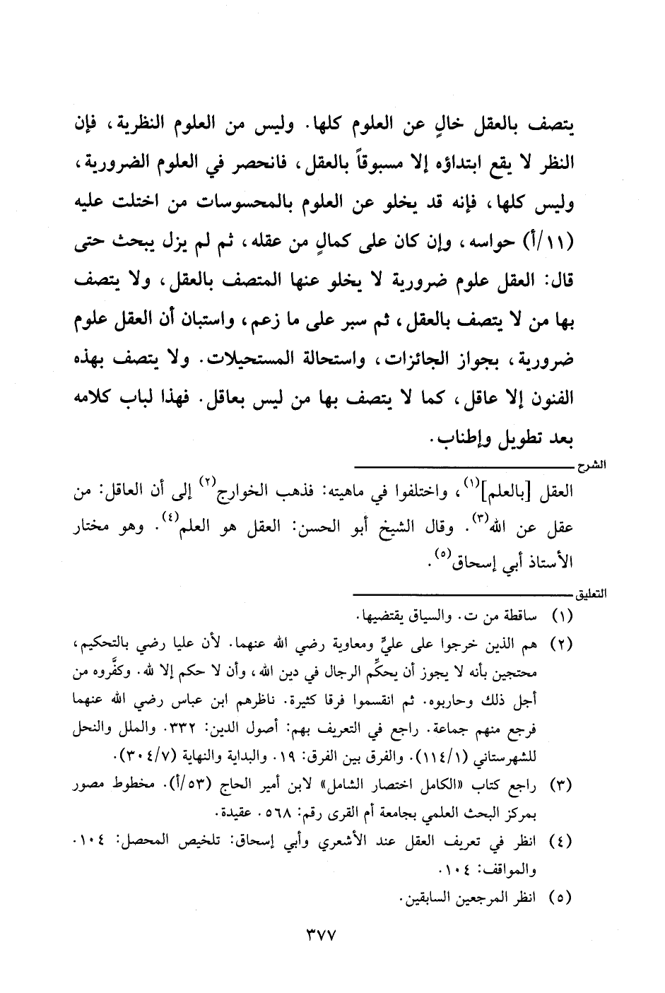 العقل [بالعلم]، واختلفوا في ماهيته: فذهب الخوارج إلى أن العاقل: من عقل عن الله. وقال الشيخ أبو الحسن: العقل هو العلم. وهو مختار الأستاذ أبي إسحاق.