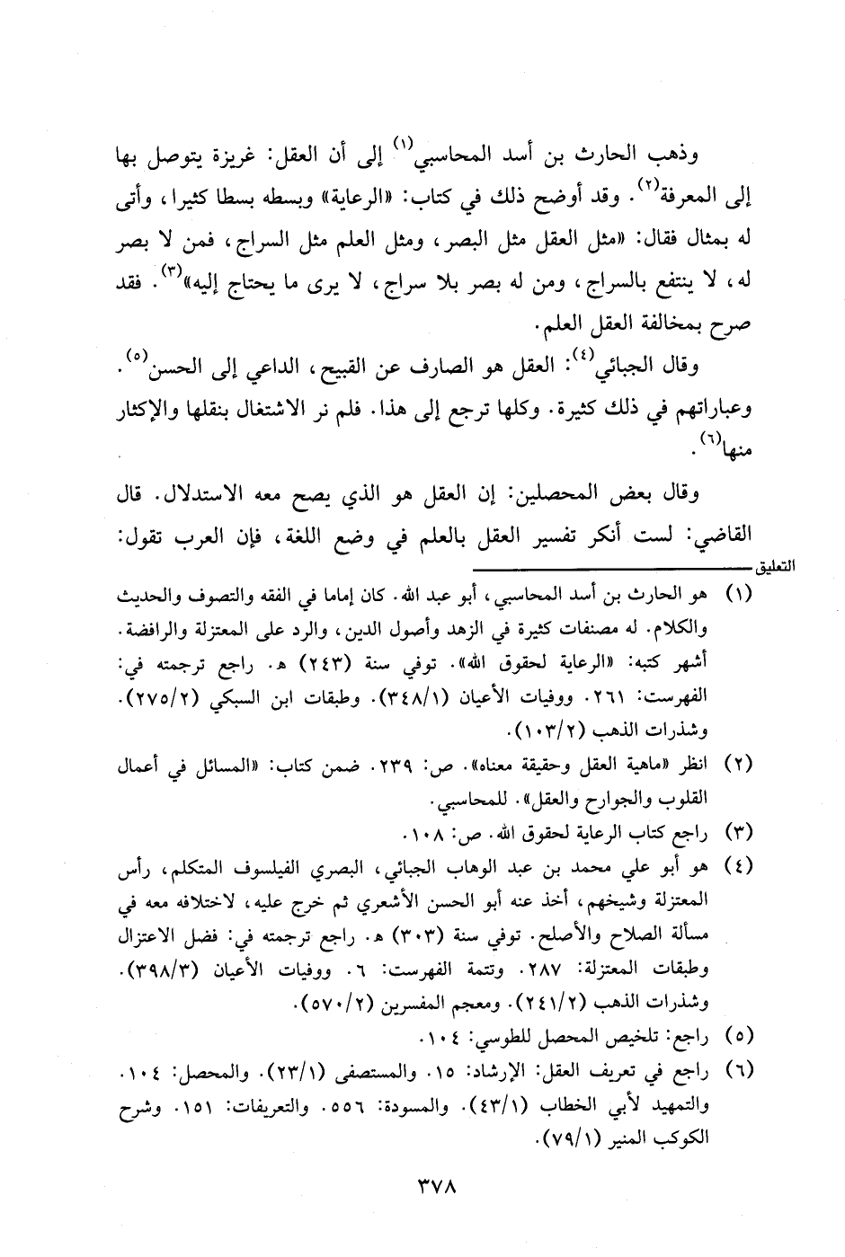 وقال الجبائي: العقل هو الصارف عن القبيح، الداعي إلى الحسن. وعباراتهم في ذلك كثيرة. وكلها ترجع إلى هذا. فلم نر الاشتغال بنقلها والإكثار منها.