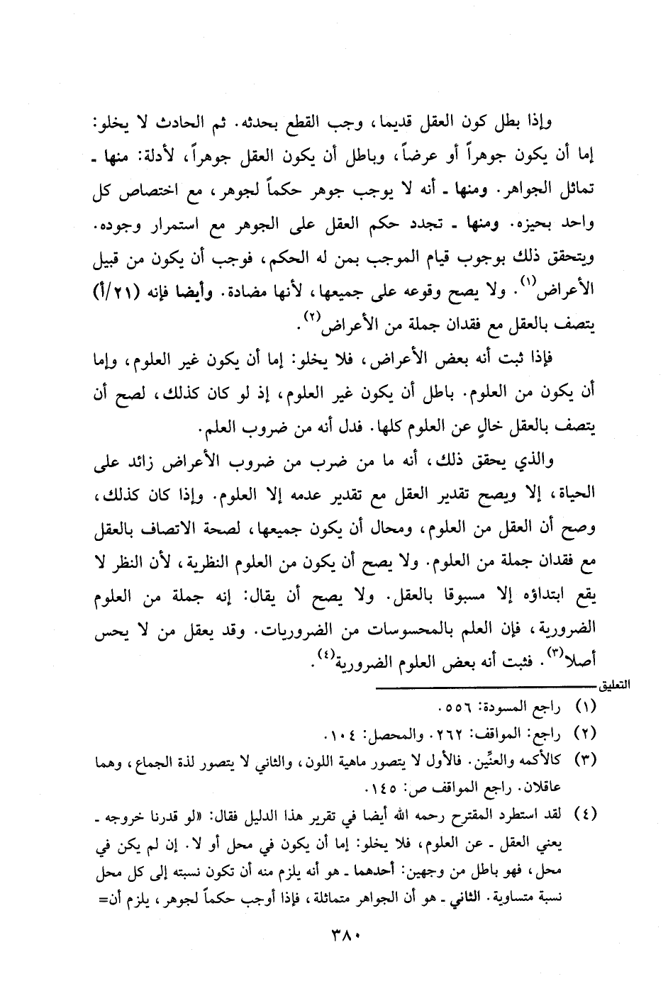 والذي يحقق ذلك، أنه ما من ضرب من ضروب الأعراض زائد على الحياة، إلا ويصح تقدير العقل مع عدمه إلا العلوم. وإذا كان كذلك، وصح أن العقل من العلوم، ومحال أن يكون جميعها، لصحة الاتصاف بالعقل مع فقدان جملة من العلوم. ولا يصح أن يكون من العلوم النظري، لأن النظر لا يقع ابتداؤه إلا مسبوقا بالعقل. ولا يصح أن يقال: إنه جملة من العلوم الضرورية، فإن العلم بالمحسوسات من الضروريات. وقد يعقل من لا يحس أصلا. فثبت أنه بعض العلوم الضرورية.