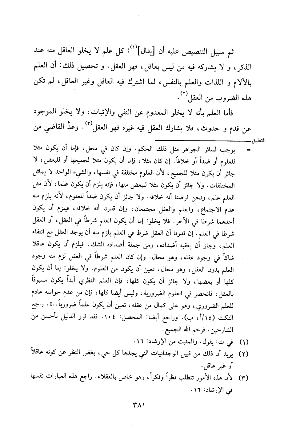 ثم سبيل التنصيص عليه أن [يقال]: كل علم لا يخلو العاقل منه عند الذكر، ولا يشاركه فيه من ليس بعاقل، فهو العقل. وتحصيل ذلك: أن العلم بالآلام واللذات والعلم بالنفس، لما اشترك فيه العاقل وغير العاقل، لم تكن هذه الضروب من العقل.