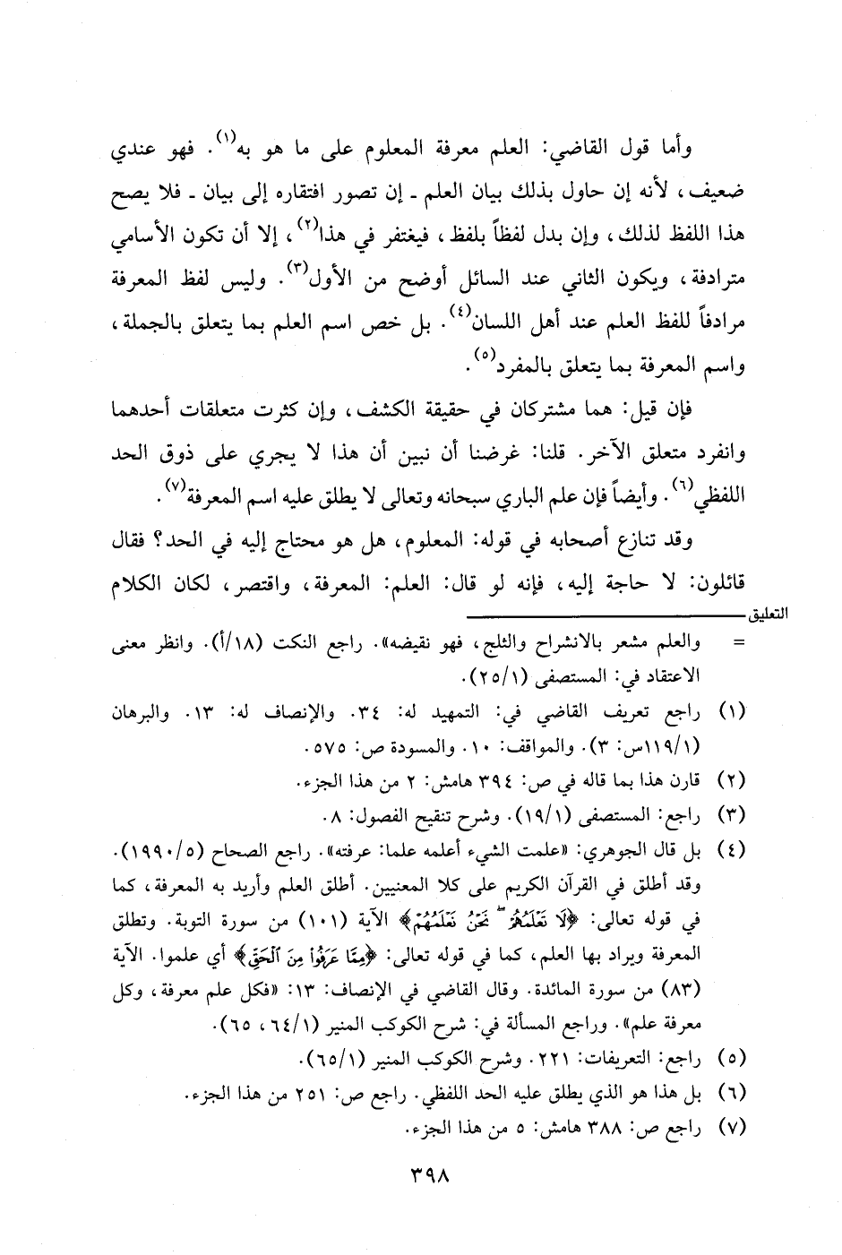 وأما قول القاضي: العلم معرفة المعلوم على ما هو به. فهو عندي ضعيف، لأنه إن حاول بذلك بيان العلم- إن تصور افتقاره إلى بيان- فلا يصح هذا اللفظ لذلك، وإن بدل لفظا بلفظ، فيغتفر في هذا، إلا أن تكون الأسامي مترادفة، ويكون الثاني عند السائل أوضح من الأول. وليس لفظ المعرفة مرادفا للفظ العلم عند أهل اللسان. بل خص اسم العلم بما يتعلق بالجملة، واسم المعرفة بما يتعلق بالمفرد.