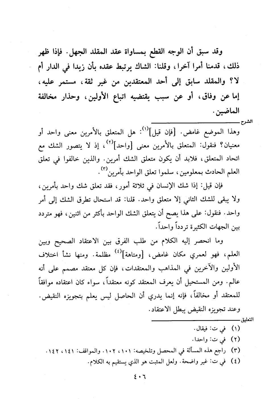 فإن قيل: إذا شك الإنسان في ثلاثة أمور، فقد تعلق شك واحد بأمرين، ولا يبقى للشك الثاني إلا متعلق واحد. قلنا: قد استحال تطرق الشك إلى أمر واحد. فنقول: على هذا يصح أن يتعلق الشك الواحد بأكثر من اثنين، فهو متردد بين الجهات الكثيرة ترددا واحدا.