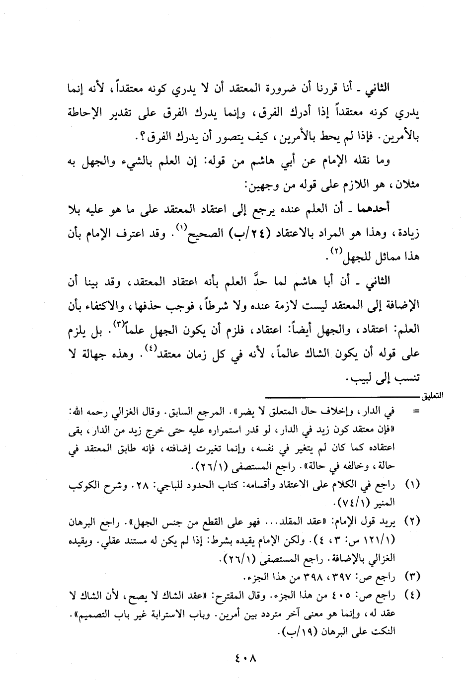 الثاني- أن أبا هاشم لما حد العلم بأنه اعتقاد المعتقد، وقد بينا أن الإضافة إلى المعتقد ليست لازمة عنده ولا شرطا، فوجب حذفها، والاكتفاء بأن العلم: اعتقاد، والجهل أيضا: اعتقاد، فلزم أن يكون الجهل علما. بل يلزم على قوله أن يكون الشاك علما، لأنه في كل زمان معتقد. وهذه جهالة لا تنسب إلى لبيب.